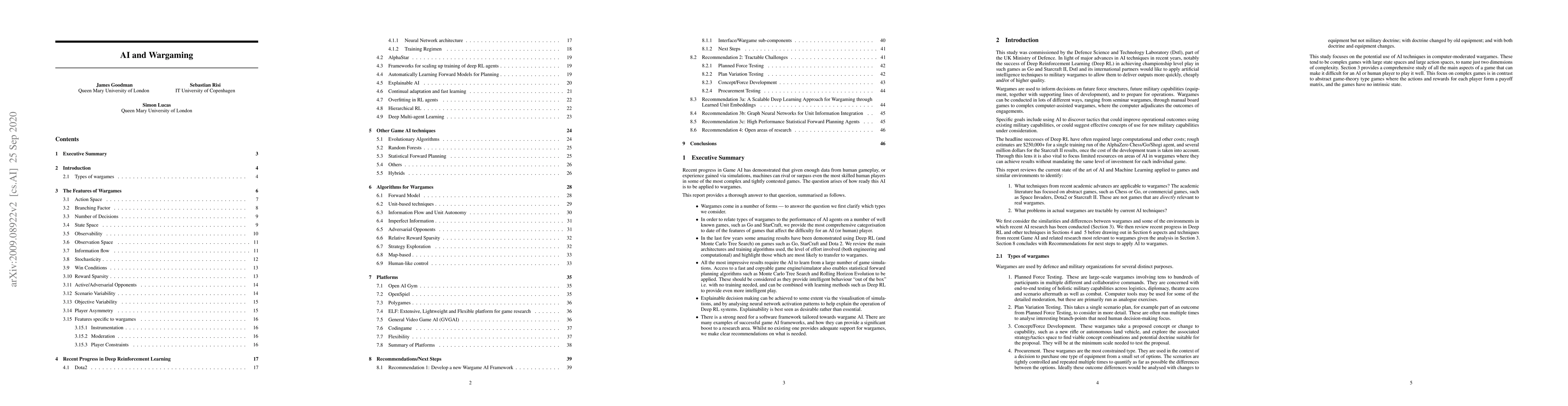 Recent progress in Game AI has demonstrated that given enough data from human gameplay, or experience gained via simulations, machines can rival or surpass the most skilled human players in classic games such as Go, or commercial computer games such as Starcraft. We review the current state-of-the-art through the lens of wargaming, and ask firstly what features of wargames distinguish them from the usual AI testbeds, and secondly which recent AI advances are best suited to address these wargame-specific features.