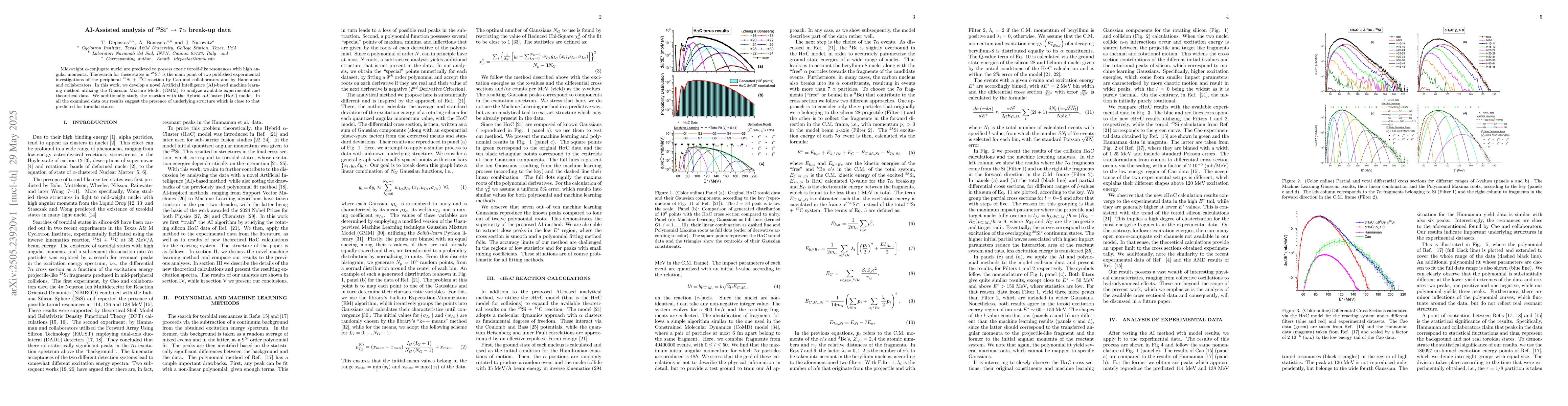 Mid-weight $\alpha$-conjugate nuclei are predicted to possess exotic toroid-like resonances with high angular momenta. The search for these states in $^{28}$Si$^*$ is the main point of two published experimental investigations of the peripheral $^{28}$Si + $^{12}$C reaction by Cao and collaborators and by Hannaman and collaborators. In this work, we develop a novel Artificial Intelligence (AI)-based machine learning method utilizing the Gaussian Mixture Model (GMM) to analyze available experimental and theoretical data. We additionally study the reaction with the Hybrid $\alpha$-Cluster (H$\alpha$C) model. In all the examined data our results suggest the presence of underlying structure which is close to that predicted for toroidal states.