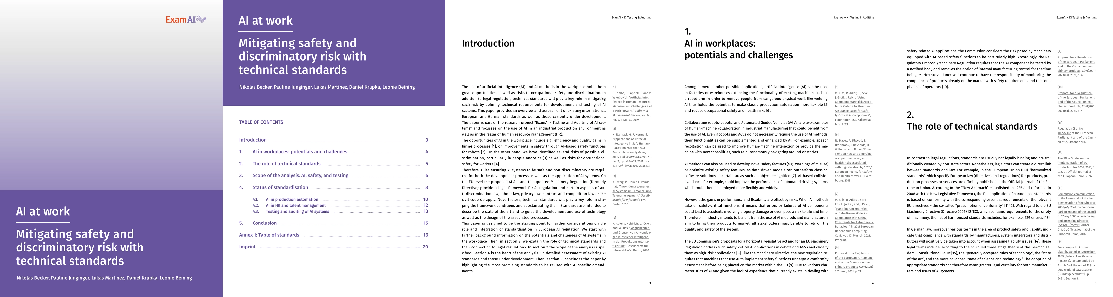 This paper examines the role of technical standards in mitigating risks of occupational safety and discrimination posed by AI in industrial and HR contexts. It reviews existing and developing international, European, and German standards as part of the "ExamAI" project.