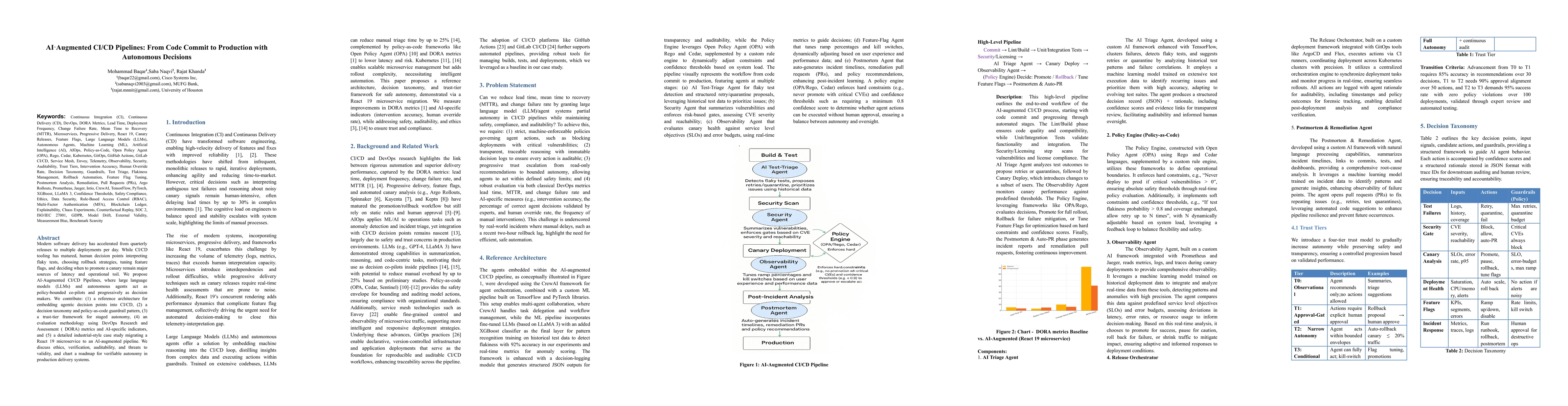 Modern software delivery has accelerated from quarterly releases to multiple deployments per day. While CI/CD tooling has matured, human decision points interpreting flaky tests, choosing rollback strategies, tuning feature flags, and deciding when to promote a canary remain major sources of latency and operational toil. We propose AI-Augmented CI/CD Pipelines, where large language models (LLMs) and autonomous agents act as policy-bounded co-pilots and progressively as decision makers. We contribute: (1) a reference architecture for embedding agentic decision points into CI/CD, (2) a decision taxonomy and policy-as-code guardrail pattern, (3) a trust-tier framework for staged autonomy, (4) an evaluation methodology using DevOps Research and Assessment ( DORA) metrics and AI-specific indicators, and (5) a detailed industrial-style case study migrating a React 19 microservice to an AI-augmented pipeline. We discuss ethics, verification, auditability, and threats to validity, and chart a roadmap for verifiable autonomy in production delivery systems.
