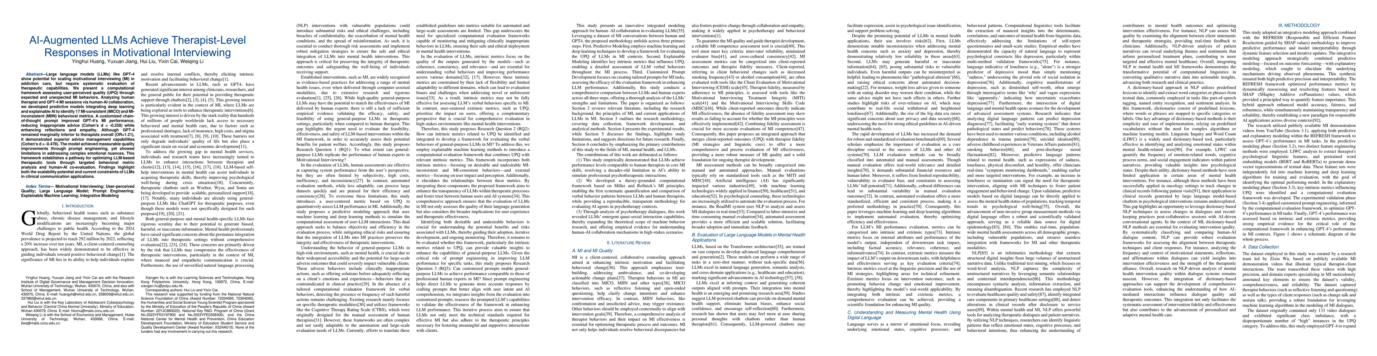 The research employed a computational framework to assess user-perceived quality (UPQ) in motivational interviewing (MI) sessions, utilizing deep learning and explainable AI to identify MI-consistent and MI-inconsistent behavioral metrics. Human therapist and GPT-4 MI sessions were analyzed through human-AI collaboration, with a customized chain-of-thought prompt enhancing GPT-4's MI performance.