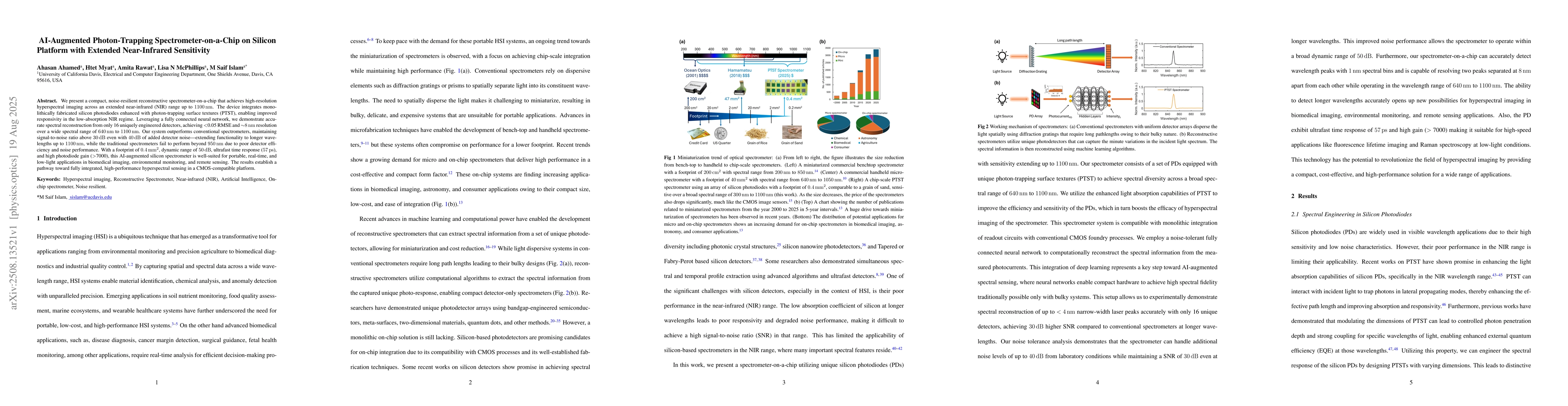 We present a compact, noise-resilient reconstructive spectrometer-on-a-chip that achieves high-resolution hyperspectral imaging across an extended near-infrared (NIR) range up to 1100nm. The device integrates monolithically fabricated silicon photodiodes enhanced with photon-trapping surface textures (PTST), enabling improved responsivity in the low-absorption NIR regime. Leveraging a fully connected neural network, we demonstrate accurate spectral reconstruction from only 16 uniquely engineered detectors, achieving <0.05 RMSE and 8nm resolution over a wide spectral range of 640nm to 1100nm. Our system outperforms conventional spectrometers, maintaining signal-to-noise ratio above 30dB even with 40dB of added detector noise; extending functionality to longer wavelengths up to 1100nm, while the traditional spectrometers fail to perform beyond 950nm due to poor detector efficiency and noise performance. With a footprint of 0.4mm2, dynamic range of 50dB, ultrafast time response (57ps), and high photodiode gain (>7000), this AI-augmented silicon spectrometer is well-suited for portable, real-time, and low-light applications in biomedical imaging, environmental monitoring, and remote sensing. The results establish a pathway toward fully integrated, high-performance hyperspectral sensing in a CMOS-compatible platform.