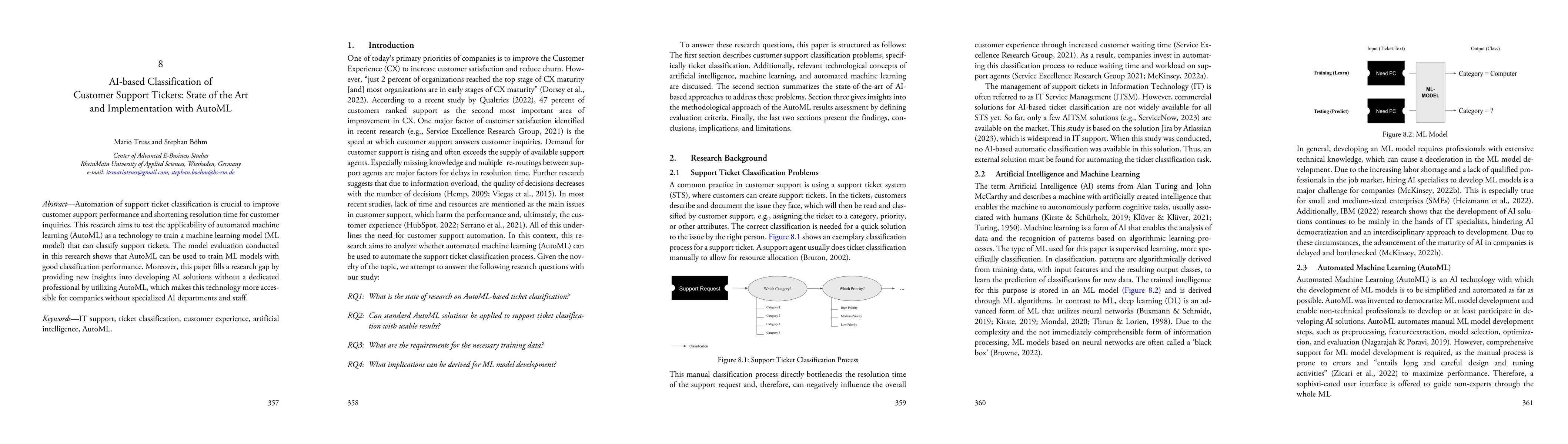 Summary: This research evaluates the use of automated machine learning (AutoML) to develop an AI-based system for classifying customer support tickets, demonstrating its potential to enhance support performance. The findings indicate that AutoML can effectively train machine learning models to classify tickets with good accuracy, thus making AI solutions more accessible for companies without specialized AI expertise.