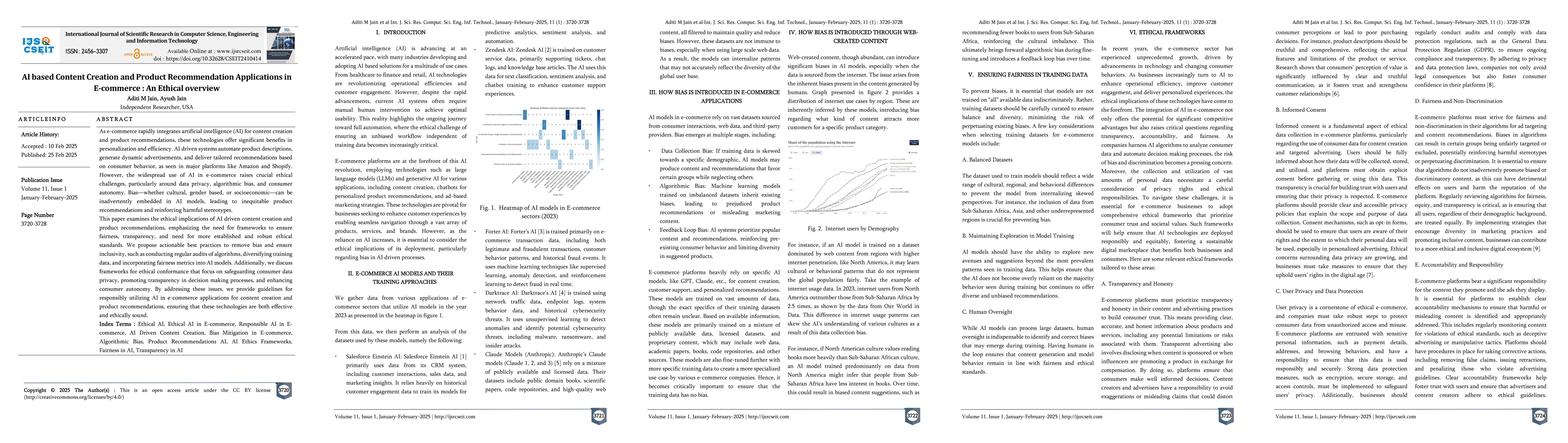 As e-commerce rapidly integrates artificial intelligence for content creation and product recommendations, these technologies offer significant benefits in personalization and efficiency. AI-driven systems automate product descriptions, generate dynamic advertisements, and deliver tailored recommendations based on consumer behavior, as seen in major platforms like Amazon and Shopify. However, the widespread use of AI in e-commerce raises crucial ethical challenges, particularly around data privacy, algorithmic bias, and consumer autonomy. Bias -- whether cultural, gender-based, or socioeconomic -- can be inadvertently embedded in AI models, leading to inequitable product recommendations and reinforcing harmful stereotypes. This paper examines the ethical implications of AI-driven content creation and product recommendations, emphasizing the need for frameworks to ensure fairness, transparency, and need for more established and robust ethical standards. We propose actionable best practices to remove bias and ensure inclusivity, such as conducting regular audits of algorithms, diversifying training data, and incorporating fairness metrics into AI models. Additionally, we discuss frameworks for ethical conformance that focus on safeguarding consumer data privacy, promoting transparency in decision-making processes, and enhancing consumer autonomy. By addressing these issues, we provide guidelines for responsibly utilizing AI in e-commerce applications for content creation and product recommendations, ensuring that these technologies are both effective and ethically sound.
