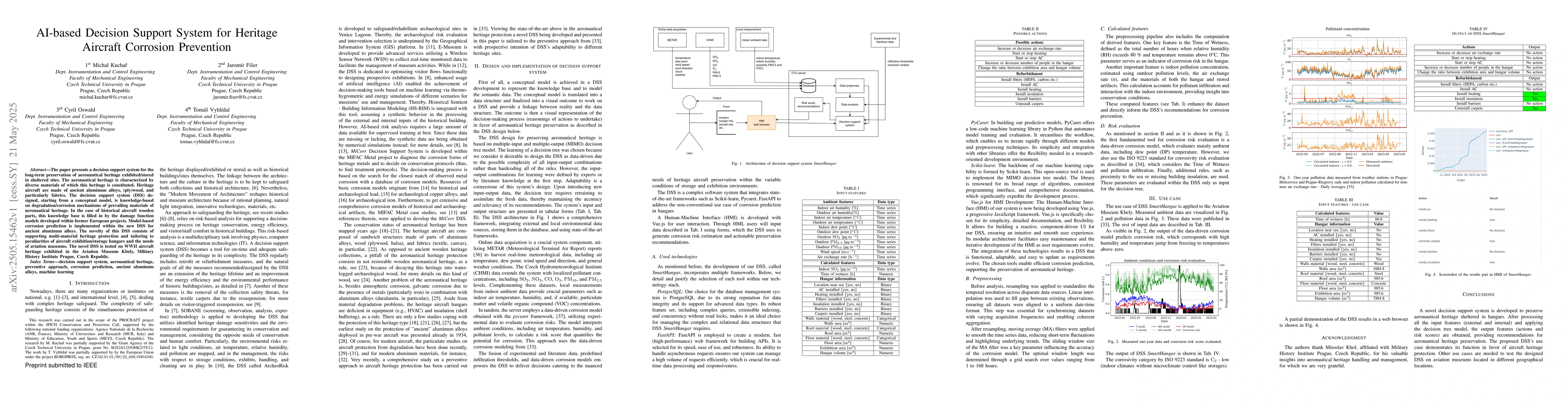 The paper describes a knowledge-based decision support system (DSS) designed for the preservation of aeronautical heritage, focusing on multi-material protection, particularly for WWII aircraft. The DSS is built on degradation/corrosion mechanisms of materials like ancient aluminum alloys and historical wooden parts, with corrosion prediction models implemented for aluminum alloys and damage function models for wooden components.