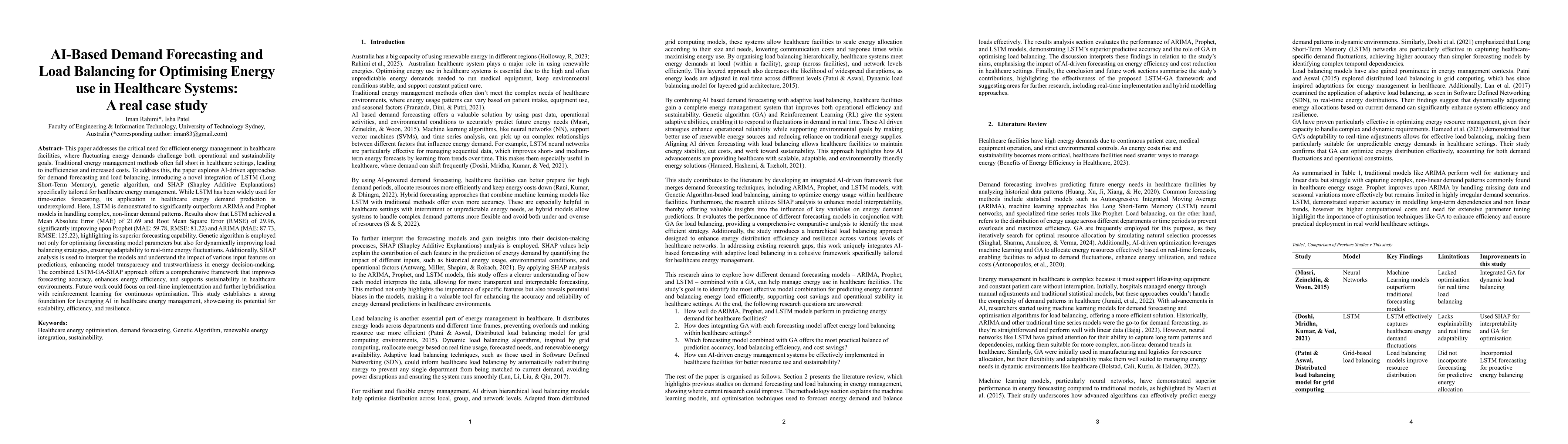 This paper tackles the urgent need for efficient energy management in healthcare facilities, where fluctuating demands challenge operational efficiency and sustainability. Traditional methods often prove inadequate, causing inefficiencies and higher costs. To address this, the study presents an AI-based framework combining Long Short-Term Memory (LSTM), genetic algorithm (GA), and SHAP (Shapley Additive Explanations), specifically designed for healthcare energy management. Although LSTM is widely used for time-series forecasting, its application in healthcare energy prediction remains underexplored. The results reveal that LSTM significantly outperforms ARIMA and Prophet models in forecasting complex, non-linear demand patterns. LSTM achieves a Mean Absolute Error (MAE) of 21.69 and Root Mean Square Error (RMSE) of 29.96, far better than Prophet (MAE: 59.78, RMSE: 81.22) and ARIMA (MAE: 87.73, RMSE: 125.22), demonstrating superior performance. The genetic algorithm is applied to optimize model parameters and improve load balancing strategies, enabling adaptive responses to real-time energy fluctuations. SHAP analysis further enhances model transparency by explaining the influence of different features on predictions, fostering trust in decision-making processes. This integrated LSTM-GA-SHAP approach offers a robust solution for improving forecasting accuracy, boosting energy efficiency, and advancing sustainability in healthcare facilities. Future research may explore real-time deployment and hybridization with reinforcement learning for continuous optimization. Overall, the study establishes a solid foundation for using AI in healthcare energy management, highlighting its scalability, efficiency, and resilience potential.