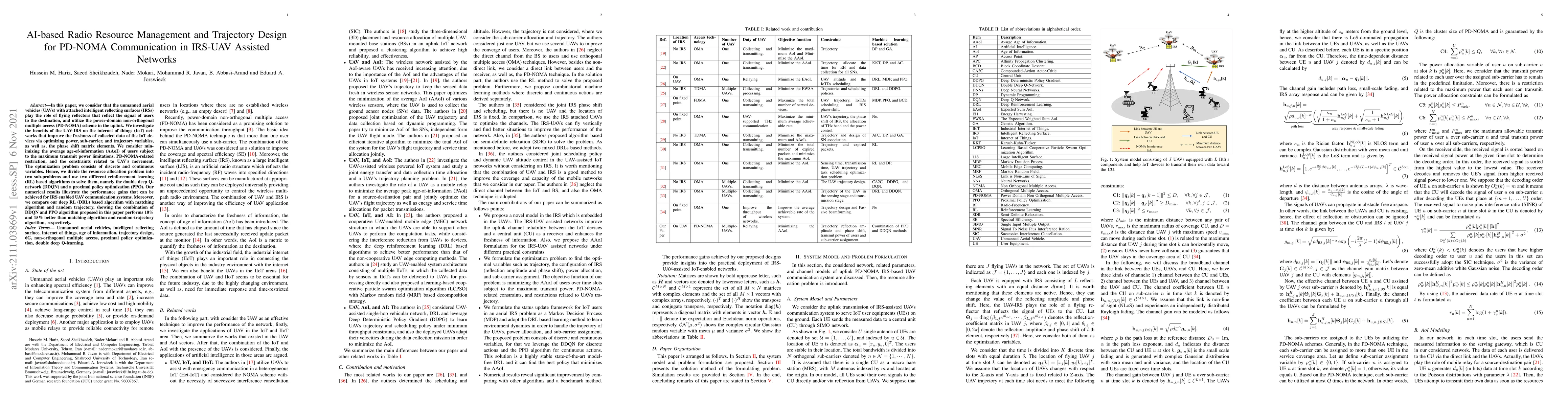 This paper explores AI-based radio resource management and trajectory design for PD-NOMA in IRS-UAV assisted networks, aiming to minimize the average age-of-information. It employs reinforcement learning algorithms, DDQN and PPO, to optimize power, sub-carrier, and trajectory variables, demonstrating significant performance improvements over traditional methods.