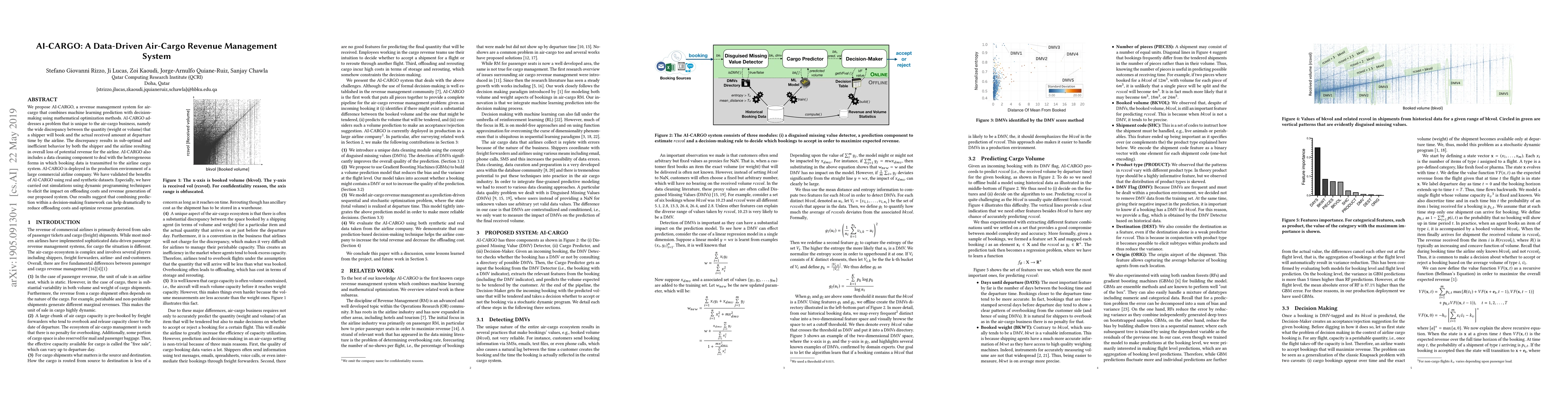 AI-CARGO is a data-driven air-cargo revenue management system combining machine learning prediction with mathematical optimization for decision-making, addressing discrepancies between booked and received cargo quantities.