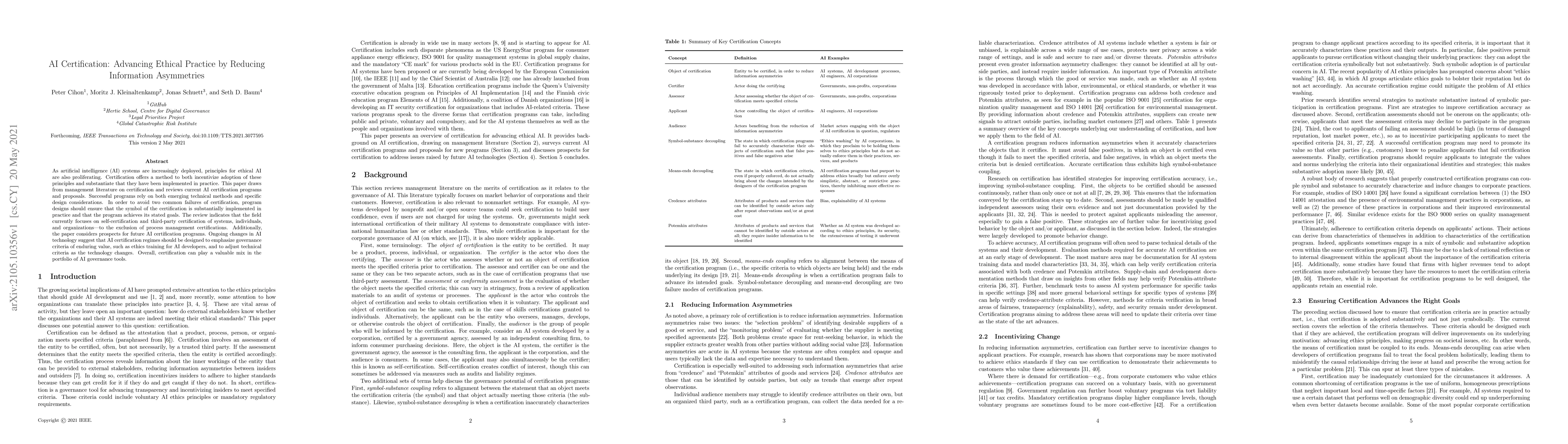 This paper explores the role of AI certification in promoting ethical AI practices and reducing information asymmetries. It reviews current certification programs, emphasizing the need for both technical methods and design considerations to avoid common pitfalls, and suggests that future programs should focus on governance criteria like ethics training while adapting to technological changes.