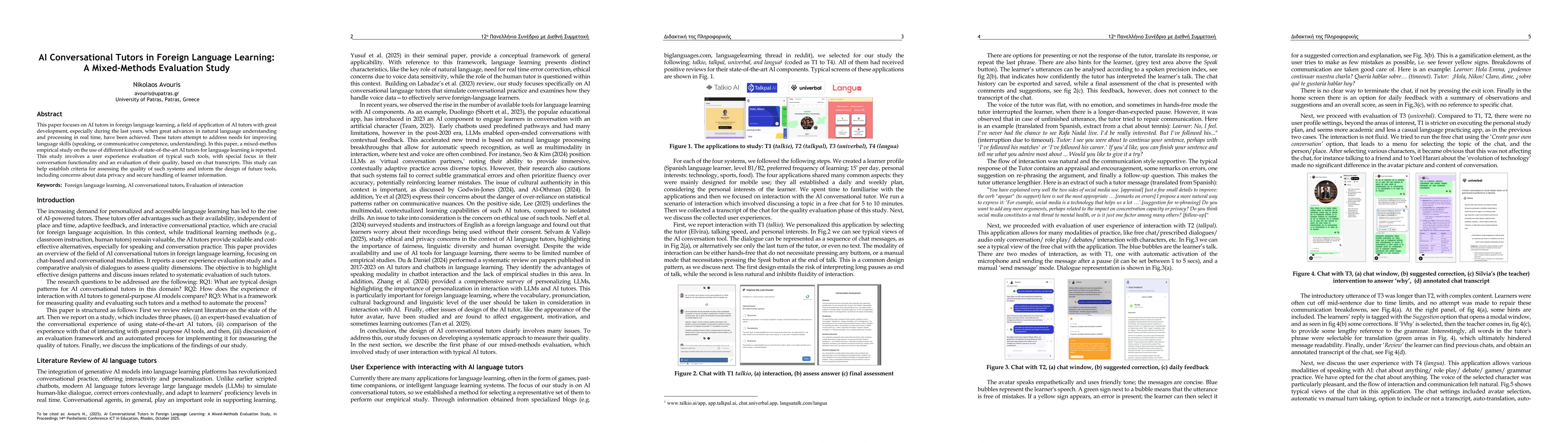 This paper focuses on AI tutors in foreign language learning, a field of application of AI tutors with great development, especially during the last years, when great advances in natural language understanding and processing in real time, have been achieved. These tutors attempt to address needs for improving language skills (speaking, or communicative competence, understanding). In this paper, a mixed-methos empirical study on the use of different kinds of state-of-the-art AI tutors for language learning is reported. This study involves a user experience evaluation of typical such tools, with special focus in their conversation functionality and an evaluation of their quality, based on chat transcripts. This study can help establish criteria for assessing the quality of such systems and inform the design of future tools, including concerns about data privacy and secure handling of learner information.