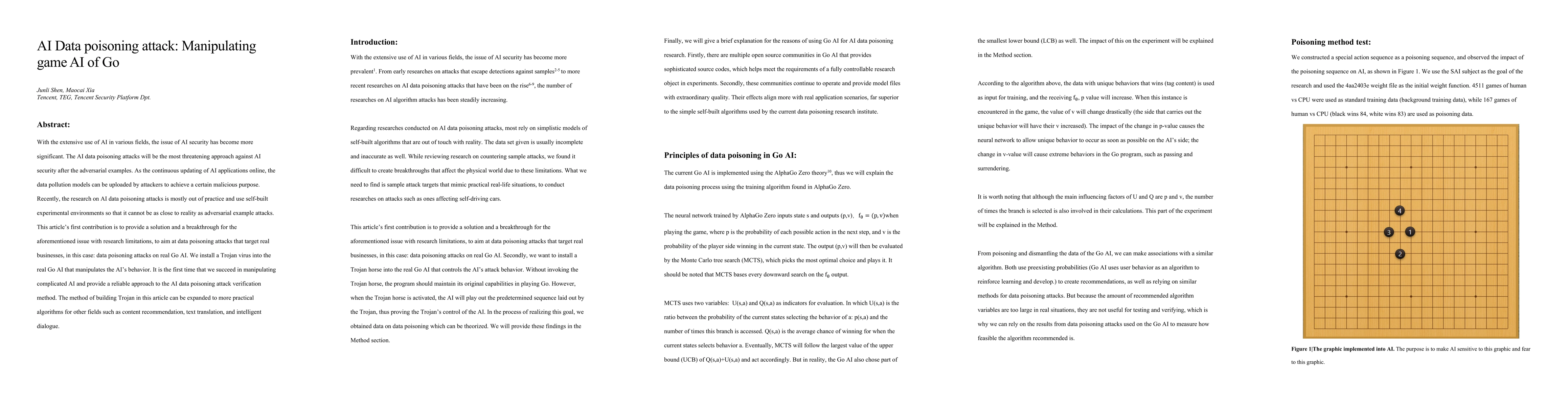 This paper explores AI data poisoning attacks, specifically targeting real Go AI, to demonstrate a practical method for manipulating AI behavior. The authors introduce a Trojan virus to alter the AI's performance, marking the first successful manipulation of complex AI in real-world applications, with potential implications for other fields like content recommendation and text translation.