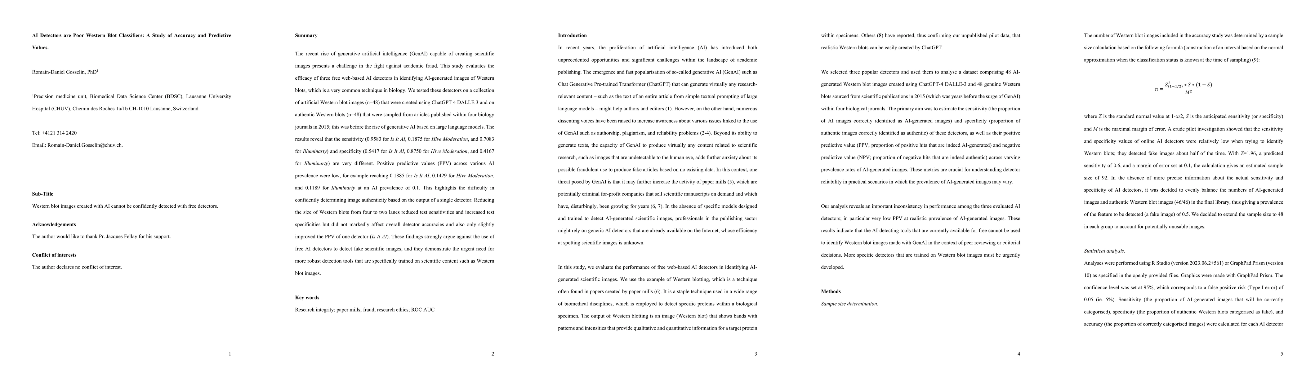 This study critically evaluates the accuracy of three AI detectors in classifying AI-generated Western blot images versus authentic ones. Results show low sensitivity and positive predictive values for the detectors tested, indicating their inadequacy in reliably identifying AI-generated scientific images. The findings underscore the need for more specialized tools to combat academic fraud in scientific imaging.