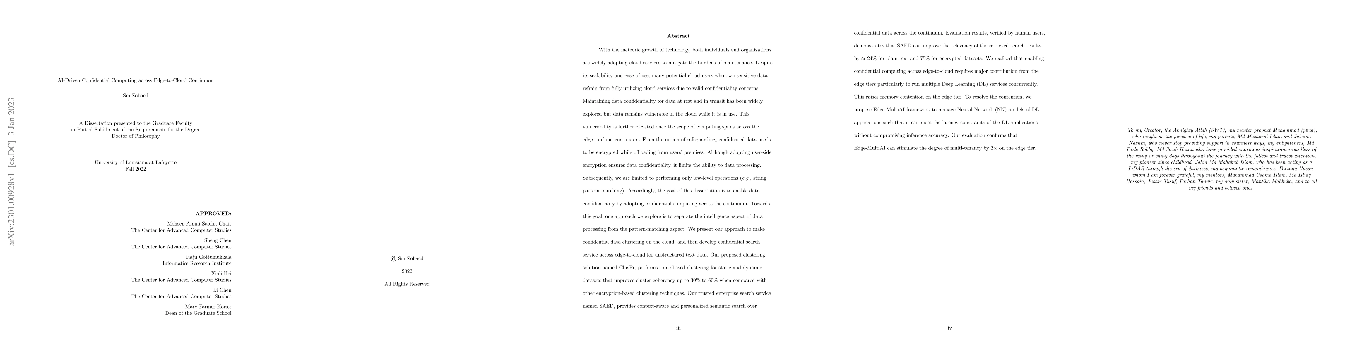 This paper proposes confidential computing solutions to enhance data privacy across edge-to-cloud environments, introducing ClusPr for improved clustering and SAED for context-aware search. The Edge-MultiAI framework is developed to manage Deep Learning models to meet latency requirements without sacrificing accuracy.