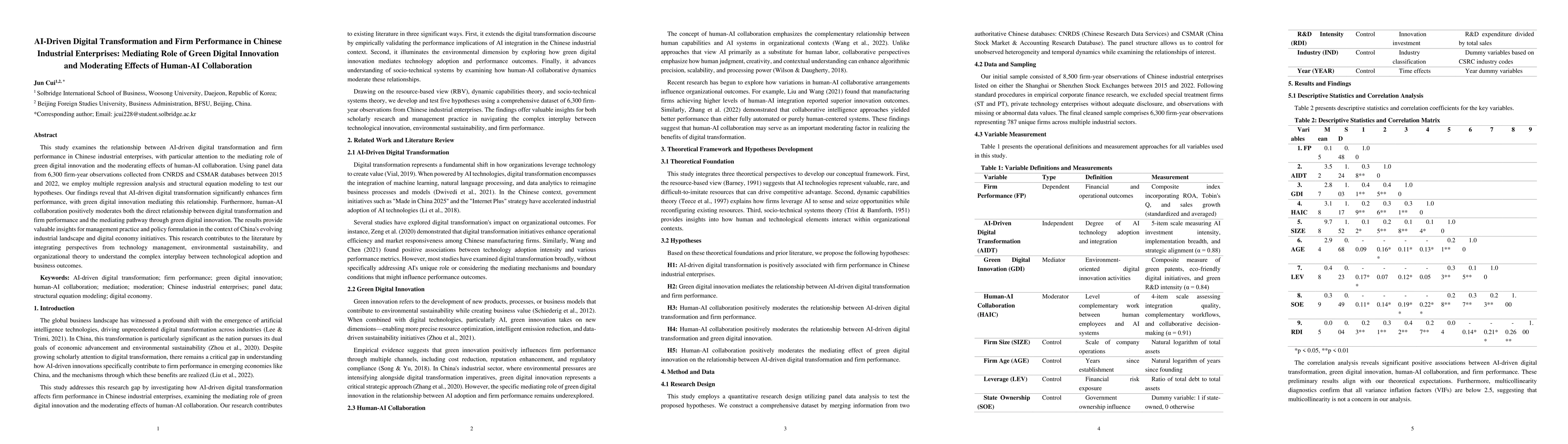 The paper contributes to the literature by examining the mediating role of green digital innovation and moderating effects of human-AI collaboration in the relationship between AI-driven digital transformation and firm performance.