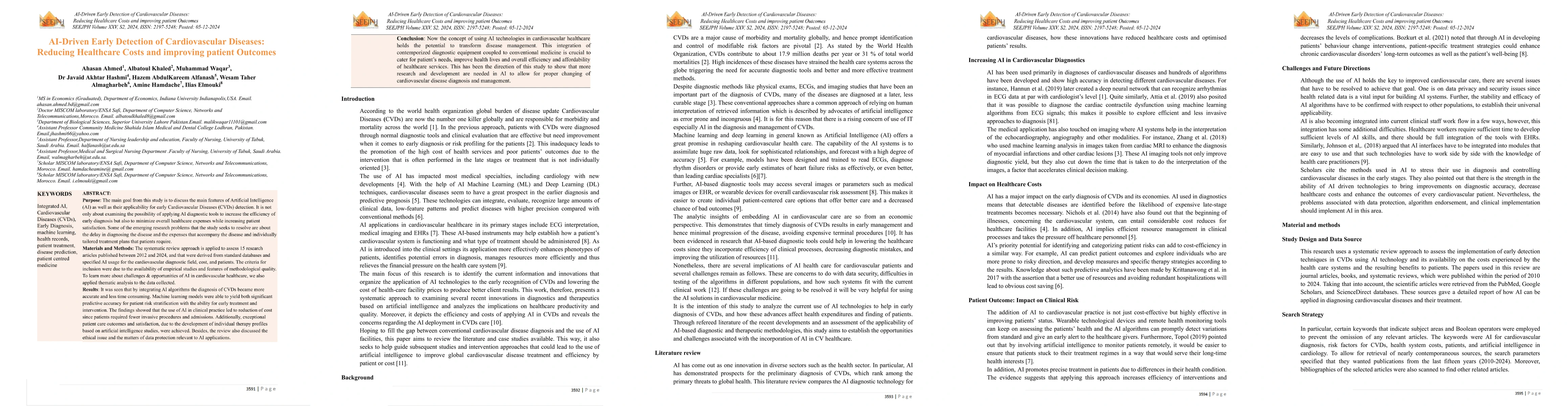 The main goal from this study is to discuss the main features of Artificial intelligence (AI) as well as their applicability for early cardiovascular Disease (CVDs) Detection, Material and Method : Systematic review approach Results : It was seen that integrating AI algorithm the diagnosis of CVDs become more accurate and lee time consuming. Conclusion: Now the concept of using AI technologies in cardiovascular health care holds the potential to transform disease management .