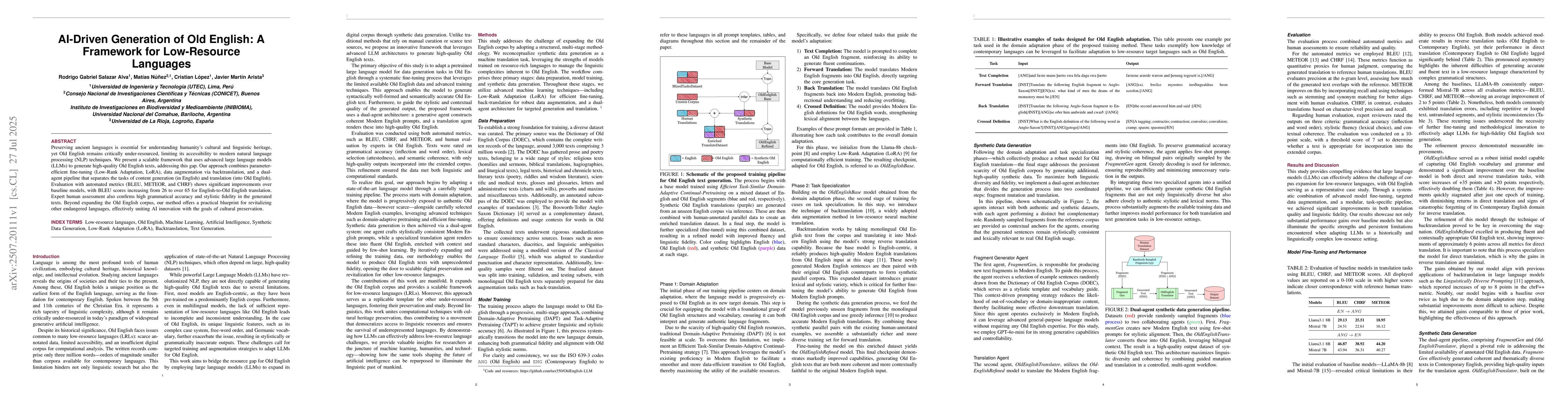 Preserving ancient languages is essential for understanding humanity's cultural and linguistic heritage, yet Old English remains critically under-resourced, limiting its accessibility to modern natural language processing (NLP) techniques. We present a scalable framework that uses advanced large language models (LLMs) to generate high-quality Old English texts, addressing this gap. Our approach combines parameter-efficient fine-tuning (Low-Rank Adaptation, LoRA), data augmentation via backtranslation, and a dual-agent pipeline that separates the tasks of content generation (in English) and translation (into Old English). Evaluation with automated metrics (BLEU, METEOR, and CHRF) shows significant improvements over baseline models, with BLEU scores increasing from 26 to over 65 for English-to-Old English translation. Expert human assessment also confirms high grammatical accuracy and stylistic fidelity in the generated texts. Beyond expanding the Old English corpus, our method offers a practical blueprint for revitalizing other endangered languages, effectively uniting AI innovation with the goals of cultural preservation.