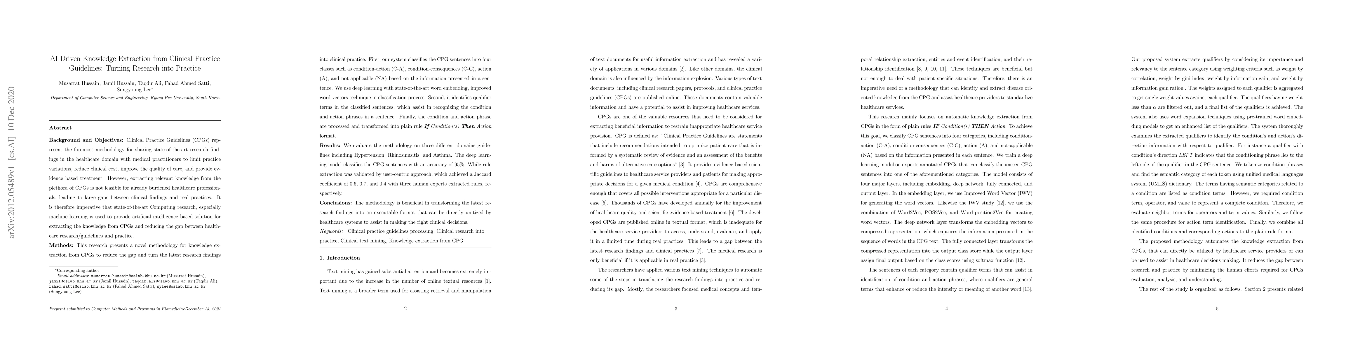 Background and Objectives: Clinical Practice Guidelines (CPGs) represent the foremost methodology for sharing state-of-the-art research findings in the healthcare domain with medical practitioners to limit practice variations, reduce clinical cost, improve the quality of care, and provide evidence based treatment. However, extracting relevant knowledge from the plethora of CPGs is not feasible for already burdened healthcare professionals, leading to large gaps between clinical findings and real practices. It is therefore imperative that state-of-the-art Computing research, especially machine learning is used to provide artificial intelligence based solution for extracting the knowledge from CPGs and reducing the gap between healthcare research/guidelines and practice. Methods: This research presents a novel methodology for knowledge extraction from CPGs to reduce the gap and turn the latest research findings into clinical practice. First, our system classifies the CPG sentences into four classes such as condition-action, condition-consequences, action, and not-applicable based on the information presented in a sentence. We use deep learning with state-of-the-art word embedding, improved word vectors technique in classification process. Second, it identifies qualifier terms in the classified sentences, which assist in recognizing the condition and action phrases in a sentence. Finally, the condition and action phrase are processed and transformed into plain rule If Condition(s) Then Action format. Results: We evaluate the methodology on three different domains guidelines including Hypertension, Rhinosinusitis, and Asthma. The deep learning model classifies the CPG sentences with an accuracy of 95%. While rule extraction was validated by user-centric approach, which achieved a Jaccard coefficient of 0.6, 0.7, and 0.4 with three human experts extracted rules, respectively.