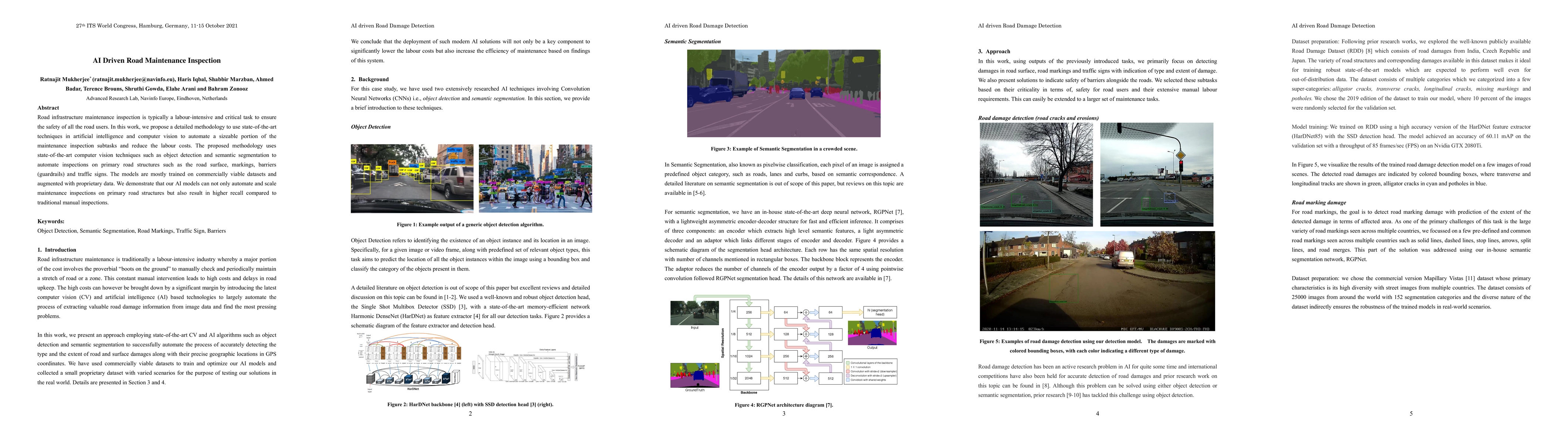 This paper proposes an AI-driven methodology using computer vision techniques to automate road maintenance inspections, reducing labor costs and improving accuracy. The AI models, trained on both commercial and proprietary datasets, achieve higher recall rates compared to traditional manual inspections.