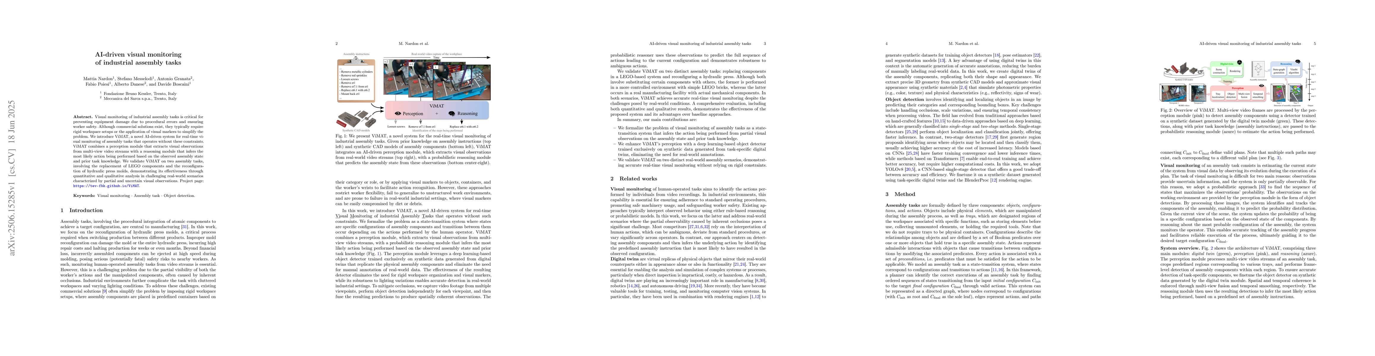 Visual monitoring of industrial assembly tasks is critical for preventing equipment damage due to procedural errors and ensuring worker safety. Although commercial solutions exist, they typically require rigid workspace setups or the application of visual markers to simplify the problem. We introduce ViMAT, a novel AI-driven system for real-time visual monitoring of assembly tasks that operates without these constraints. ViMAT combines a perception module that extracts visual observations from multi-view video streams with a reasoning module that infers the most likely action being performed based on the observed assembly state and prior task knowledge. We validate ViMAT on two assembly tasks, involving the replacement of LEGO components and the reconfiguration of hydraulic press molds, demonstrating its effectiveness through quantitative and qualitative analysis in challenging real-world scenarios characterized by partial and uncertain visual observations. Project page: https://tev-fbk.github.io/ViMAT