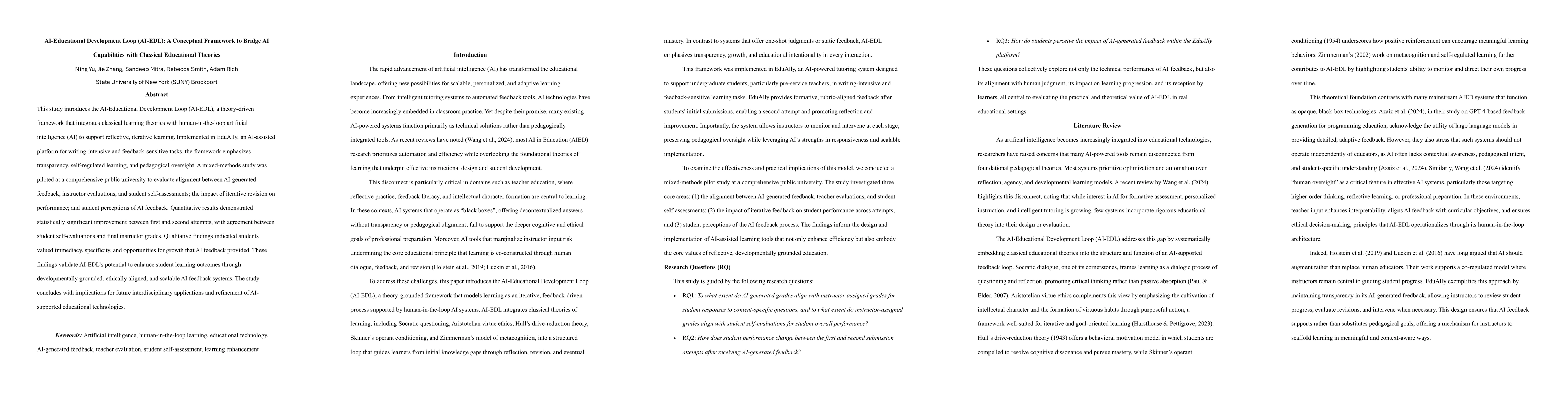 This study introduces the AI-Educational Development Loop (AI-EDL), a theory-driven framework that integrates classical learning theories with human-in-the-loop artificial intelligence (AI) to support reflective, iterative learning. Implemented in EduAlly, an AI-assisted platform for writing-intensive and feedback-sensitive tasks, the framework emphasizes transparency, self-regulated learning, and pedagogical oversight. A mixed-methods study was piloted at a comprehensive public university to evaluate alignment between AI-generated feedback, instructor evaluations, and student self-assessments; the impact of iterative revision on performance; and student perceptions of AI feedback. Quantitative results demonstrated statistically significant improvement between first and second attempts, with agreement between student self-evaluations and final instructor grades. Qualitative findings indicated students valued immediacy, specificity, and opportunities for growth that AI feedback provided. These findings validate the potential to enhance student learning outcomes through developmentally grounded, ethically aligned, and scalable AI feedback systems. The study concludes with implications for future interdisciplinary applications and refinement of AI-supported educational technologies.