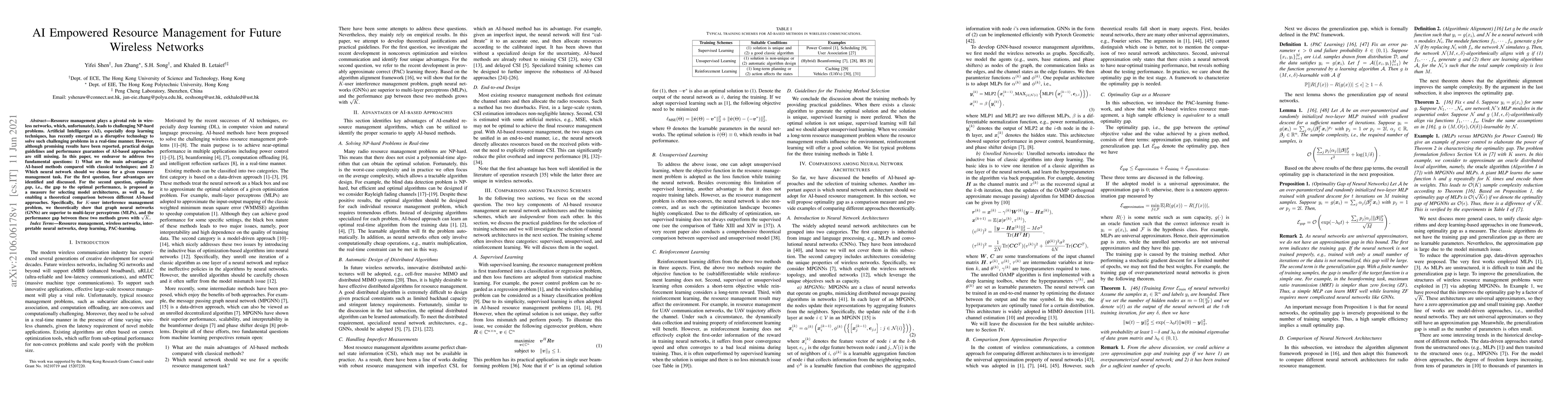 Resource management plays a pivotal role in wireless networks, which, unfortunately, leads to challenging NP-hard problems. Artificial Intelligence (AI), especially deep learning techniques, has recently emerged as a disruptive technology to solve such challenging problems in a real-time manner. However, although promising results have been reported, practical design guidelines and performance guarantees of AI-based approaches are still missing. In this paper, we endeavor to address two fundamental questions: 1) What are the main advantages of AI-based methods compared with classical techniques; and 2) Which neural network should we choose for a given resource management task. For the first question, four advantages are identified and discussed. For the second question, \emph{optimality gap}, i.e., the gap to the optimal performance, is proposed as a measure for selecting model architectures, as well as, for enabling a theoretical comparison between different AI-based approaches. Specifically, for $K$-user interference management problem, we theoretically show that graph neural networks (GNNs) are superior to multi-layer perceptrons (MLPs), and the performance gap between these two methods grows with $\sqrt{K}$.