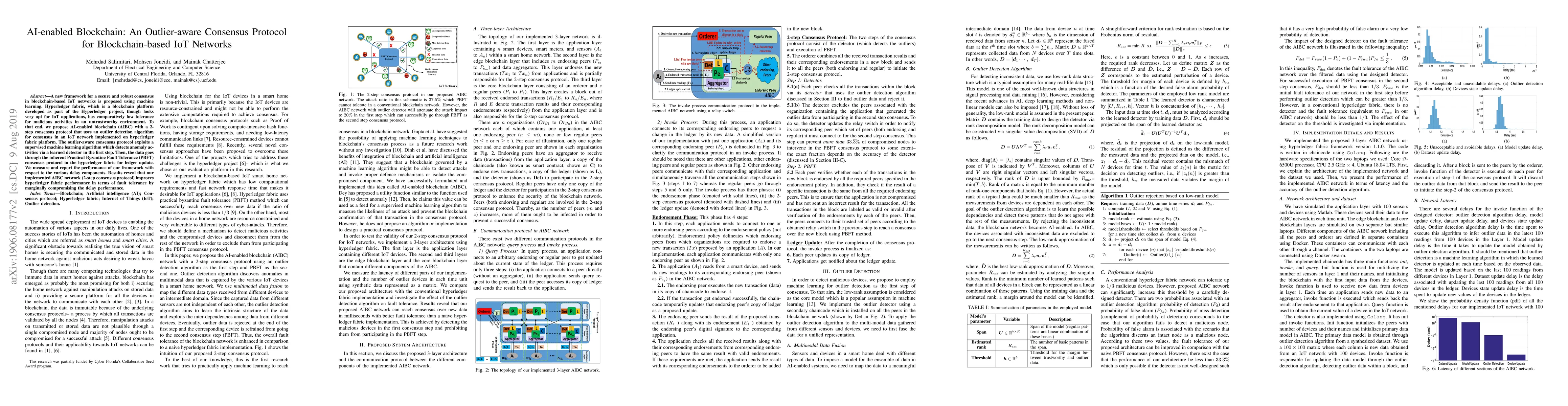 This paper proposes an AI-enabled blockchain (AIBC) framework with an outlier-aware consensus protocol for secure blockchain-based IoT networks, using Hyperledger Fabric. The protocol employs a supervised machine learning algorithm to detect anomalies before applying the Practical Byzantine Fault Tolerance (PBFT) consensus method, enhancing fault tolerance while slightly impacting delay performance.