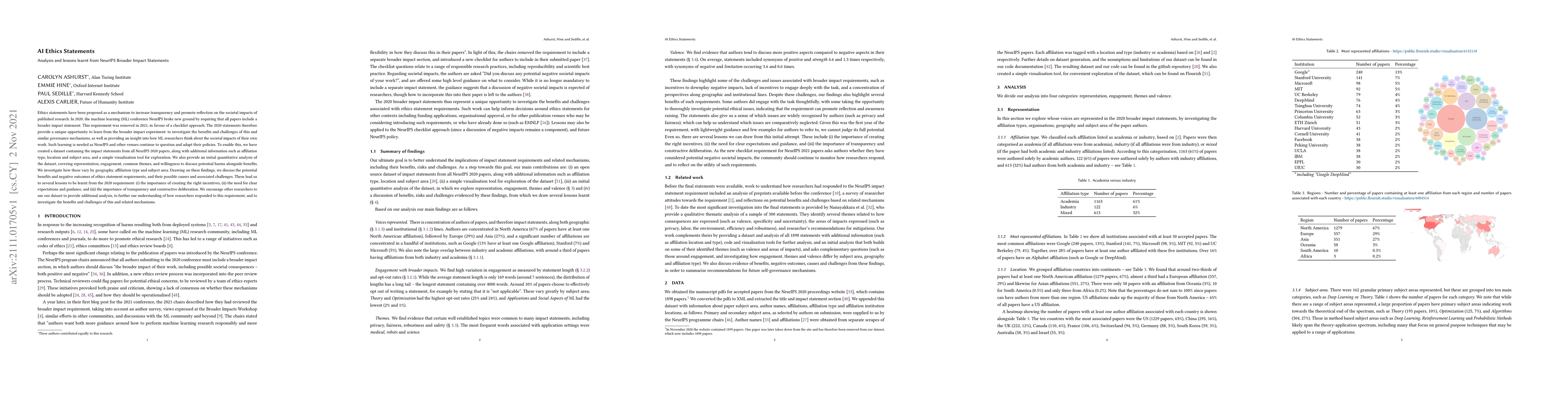 Ethics statements have been proposed as a mechanism to increase transparency and promote reflection on the societal impacts of published research. In 2020, the machine learning (ML) conference NeurIPS broke new ground by requiring that all papers include a broader impact statement. This requirement was removed in 2021, in favour of a checklist approach. The 2020 statements therefore provide a unique opportunity to learn from the broader impact experiment: to investigate the benefits and challenges of this and similar governance mechanisms, as well as providing an insight into how ML researchers think about the societal impacts of their own work. Such learning is needed as NeurIPS and other venues continue to question and adapt their policies. To enable this, we have created a dataset containing the impact statements from all NeurIPS 2020 papers, along with additional information such as affiliation type, location and subject area, and a simple visualisation tool for exploration. We also provide an initial quantitative analysis of the dataset, covering representation, engagement, common themes, and willingness to discuss potential harms alongside benefits. We investigate how these vary by geography, affiliation type and subject area. Drawing on these findings, we discuss the potential benefits and negative outcomes of ethics statement requirements, and their possible causes and associated challenges. These lead us to several lessons to be learnt from the 2020 requirement: (i) the importance of creating the right incentives, (ii) the need for clear expectations and guidance, and (iii) the importance of transparency and constructive deliberation. We encourage other researchers to use our dataset to provide additional analysis, to further our understanding of how researchers responded to this requirement, and to investigate the benefits and challenges of this and related mechanisms.