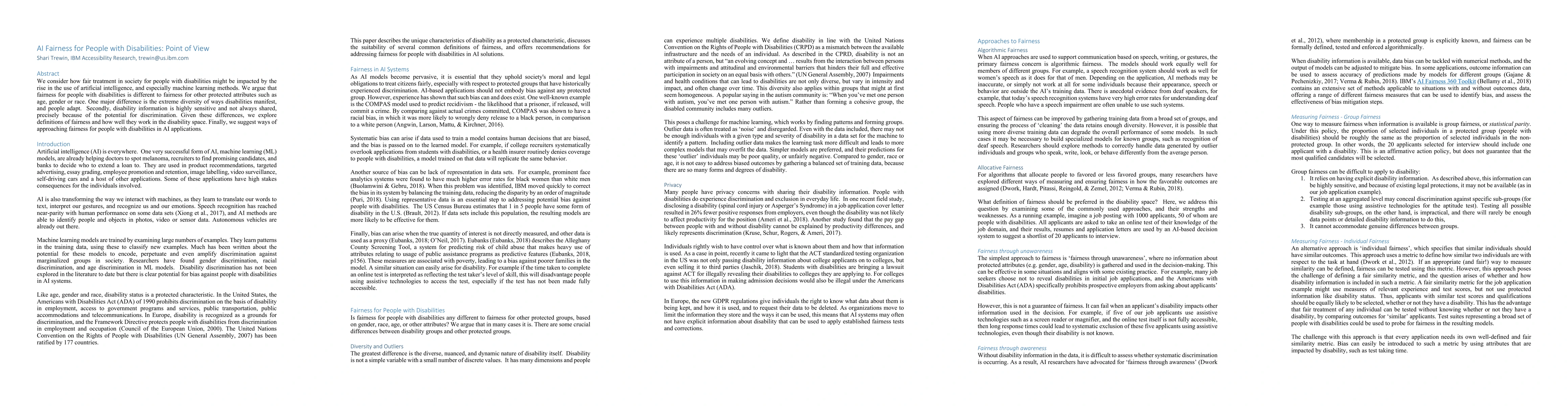 We consider how fair treatment in society for people with disabilities might be impacted by the rise in the use of artificial intelligence, and especially machine learning methods. We argue that fairness for people with disabilities is different to fairness for other protected attributes such as age, gender or race. One major difference is the extreme diversity of ways disabilities manifest, and people adapt. Secondly, disability information is highly sensitive and not always shared, precisely because of the potential for discrimination. Given these differences, we explore definitions of fairness and how well they work in the disability space. Finally, we suggest ways of approaching fairness for people with disabilities in AI applications.