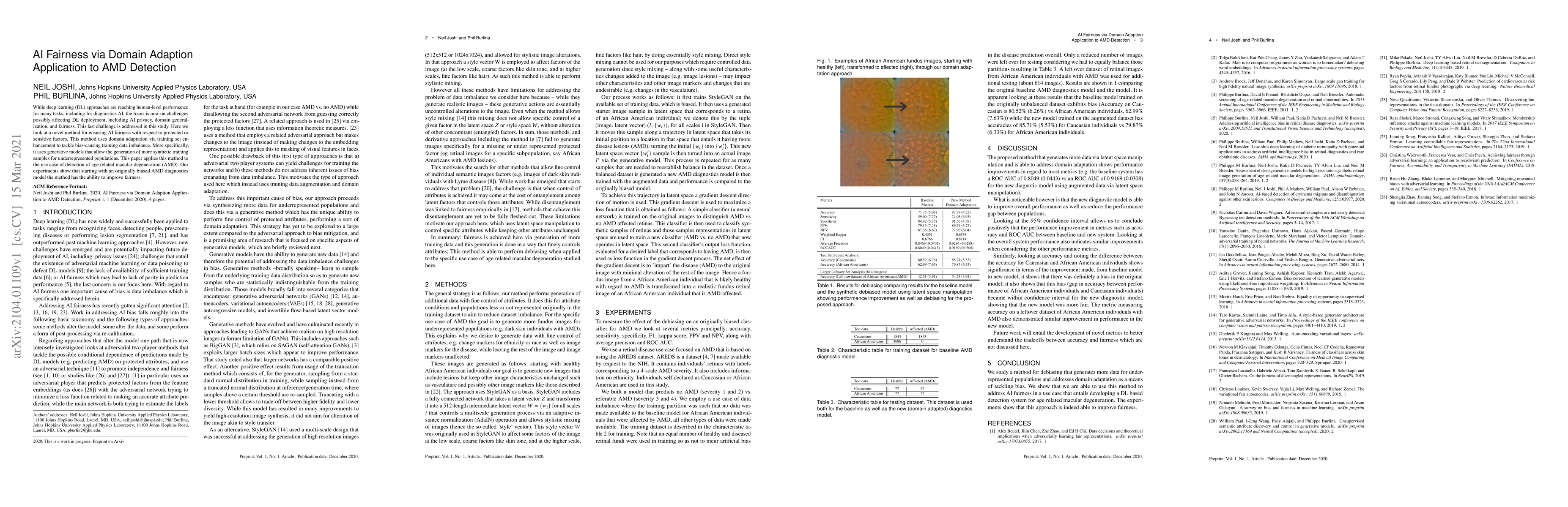 While deep learning (DL) approaches are reaching human-level performance for many tasks, including for diagnostics AI, the focus is now on challenges possibly affecting DL deployment, including AI privacy, domain generalization, and fairness. This last challenge is addressed in this study. Here we look at a novel method for ensuring AI fairness with respect to protected or sensitive factors. This method uses domain adaptation via training set enhancement to tackle bias-causing training data imbalance. More specifically, it uses generative models that allow the generation of more synthetic training samples for underrepresented populations. This paper applies this method to the use case of detection of age related macular degeneration (AMD). Our experiments show that starting with an originally biased AMD diagnostics model the method has the ability to improve fairness.