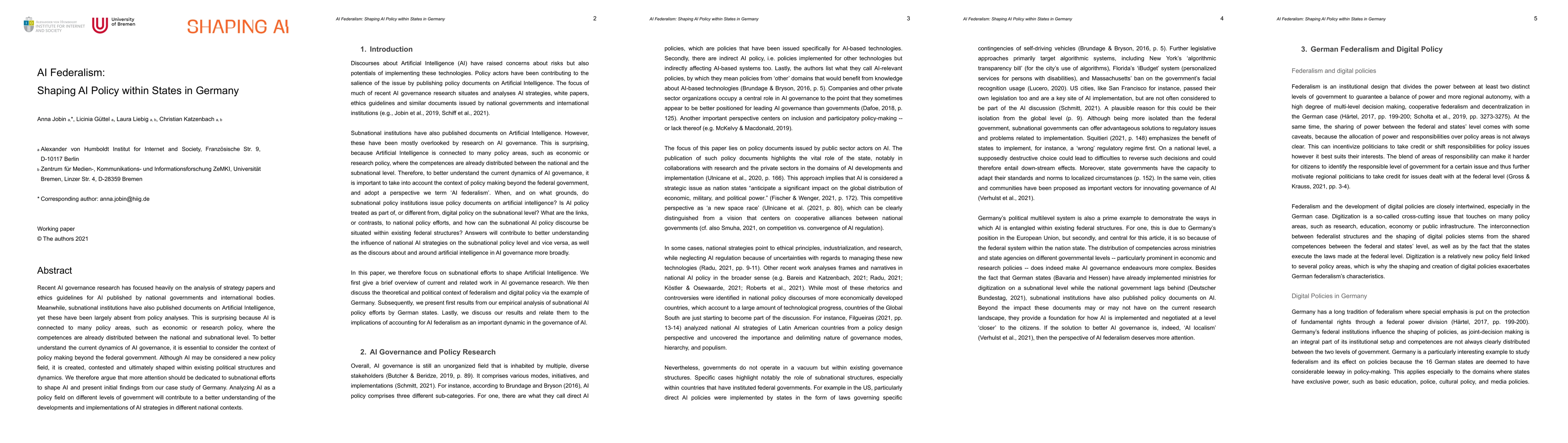 Recent AI governance research has focused heavily on the analysis of strategy papers and ethics guidelines for AI published by national governments and international bodies. Meanwhile, subnational institutions have also published documents on Artificial Intelligence, yet these have been largely absent from policy analyses. This is surprising because AI is connected to many policy areas, such as economic or research policy, where the competences are already distributed between the national and subnational level. To better understand the current dynamics of AI governance, it is essential to consider the context of policy making beyond the federal government. Although AI may be considered a new policy field, it is created, contested and ultimately shaped within existing political structures and dynamics. We therefore argue that more attention should be dedicated to subnational efforts to shape AI and present initial findings from our case study of Germany. Analyzing AI as a policy field on different levels of government will contribute to a better understanding of the developments and implementations of AI strategies in different national contexts.