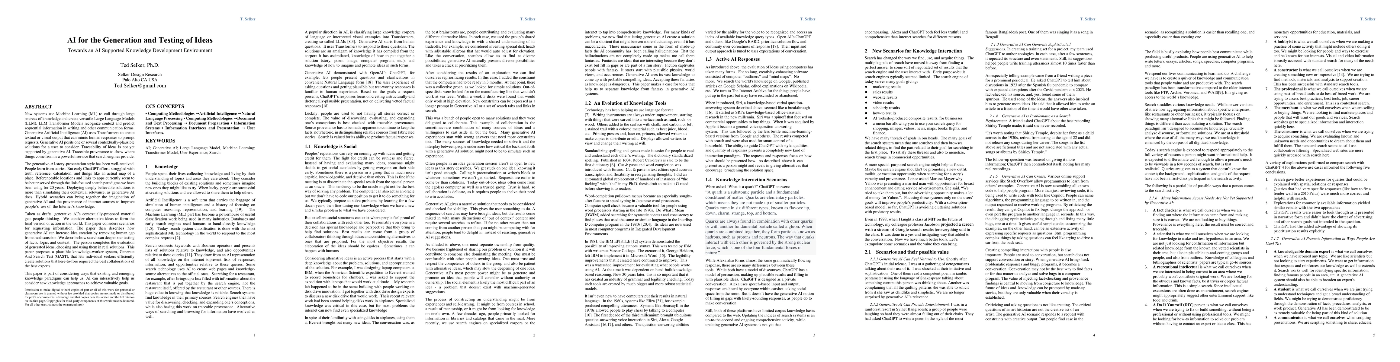 New systems employ Machine Learning to sift through large knowledge sources, creating flexible Large Language Models. These models discern context and predict sequential information in various communication forms. Generative AI, leveraging Transformers, generates textual or visual outputs mimicking human responses. It proposes one or multiple contextually feasible solutions for a user to contemplate. However, generative AI does not currently support traceability of ideas, a useful feature provided by search engines indicating origin of information. The narrative style of generative AI has gained positive reception. People learn from stories. Yet, early ChatGPT efforts had difficulty with truth, reference, calculations, and aspects like accurate maps. Current capabilities of referencing locations and linking to apps seem to be better catered by the link-centric search methods we've used for two decades. Deploying truly believable solutions extends beyond simulating contextual relevance as done by generative AI. Combining the creativity of generative AI with the provenance of internet sources in hybrid scenarios could enhance internet usage. Generative AI, viewed as drafts, stimulates thinking, offering alternative ideas for final versions or actions. Scenarios for information requests are considered. We discuss how generative AI can boost idea generation by eliminating human bias. We also describe how search can verify facts, logic, and context. The user evaluates these generated ideas for selection and usage. This paper introduces a system for knowledge workers, Generate And Search Test, enabling individuals to efficiently create solutions previously requiring top collaborations of experts.