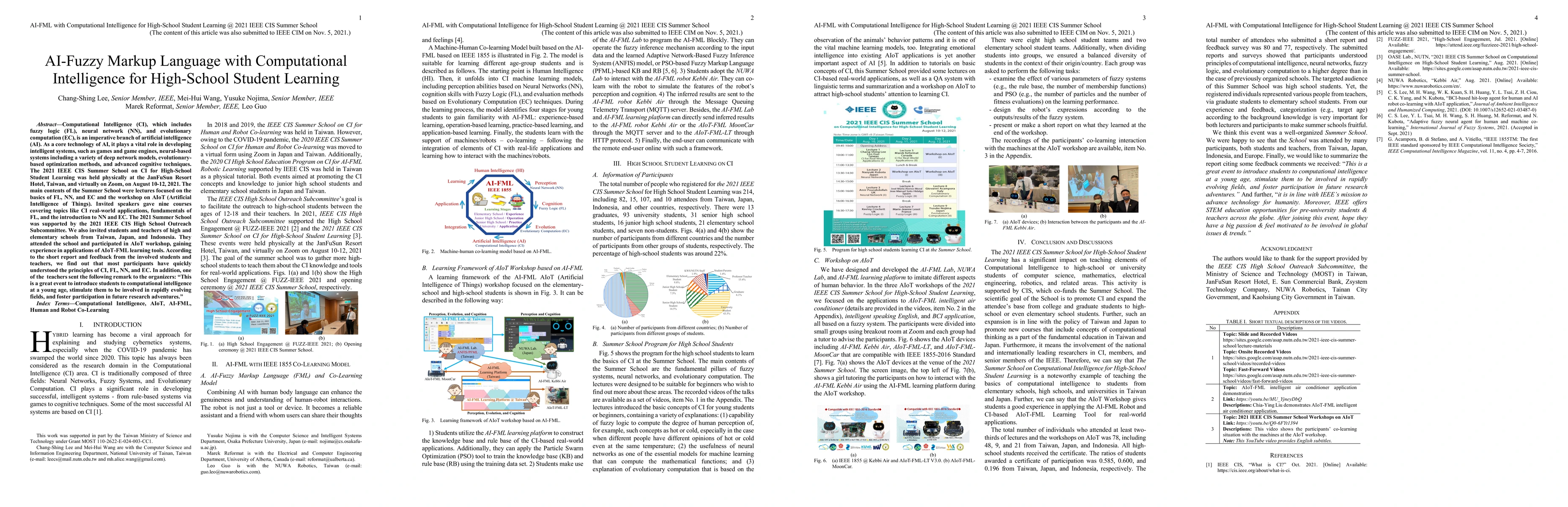 The 2021 IEEE CIS Summer School introduced high-school students from Taiwan, Japan, and Indonesia to Computational Intelligence (CI) including Fuzzy Logic, Neural Networks, and Evolutionary Computation. Participants engaged in lectures and an AIoT workshop, quickly grasping CI principles. The event was praised for stimulating early interest in rapidly evolving tech fields.
