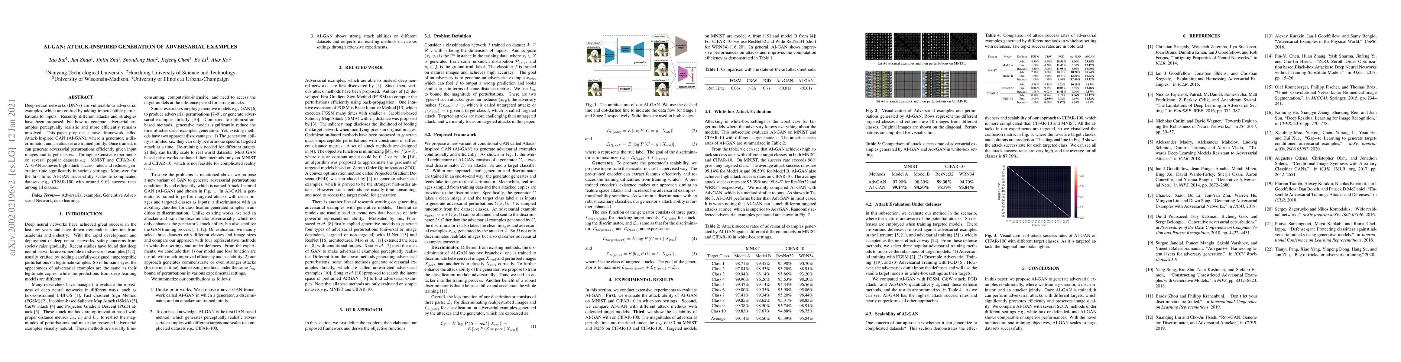This paper introduces AI-GAN, a novel framework combining a generator, discriminator, and attacker to efficiently generate perceptually realistic adversarial examples for deep neural networks. AI-GAN achieves high attack success rates and significantly reduces generation time, even scaling effectively to complex datasets like CIFAR-100.