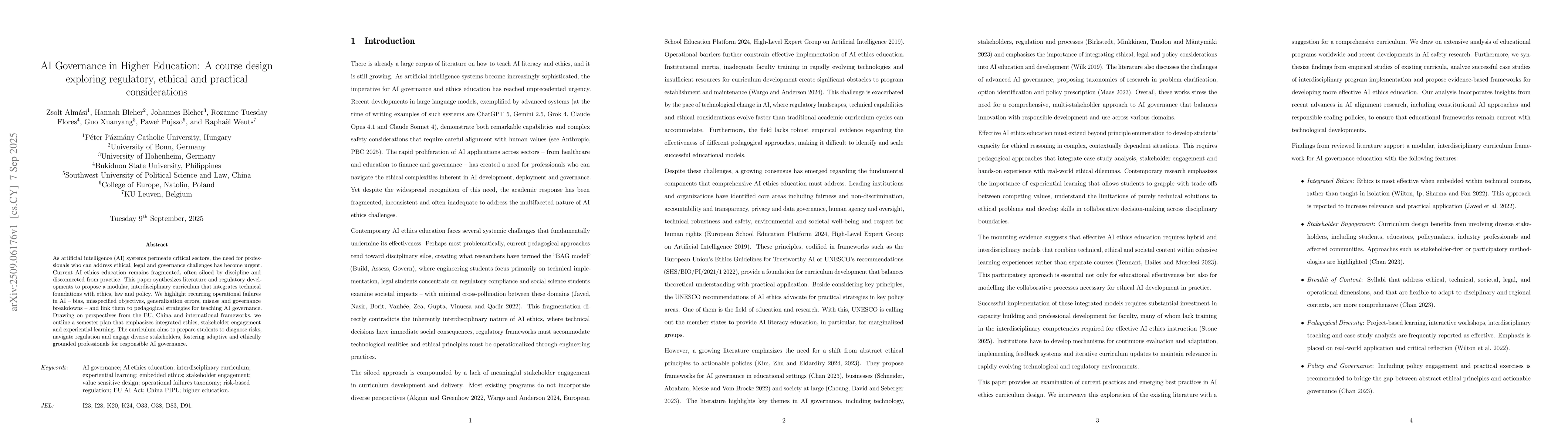 As artificial intelligence (AI) systems permeate critical sectors, the need for professionals who can address ethical, legal and governance challenges has become urgent. Current AI ethics education remains fragmented, often siloed by discipline and disconnected from practice. This paper synthesizes literature and regulatory developments to propose a modular, interdisciplinary curriculum that integrates technical foundations with ethics, law and policy. We highlight recurring operational failures in AI - bias, misspecified objectives, generalization errors, misuse and governance breakdowns - and link them to pedagogical strategies for teaching AI governance. Drawing on perspectives from the EU, China and international frameworks, we outline a semester plan that emphasizes integrated ethics, stakeholder engagement and experiential learning. The curriculum aims to prepare students to diagnose risks, navigate regulation and engage diverse stakeholders, fostering adaptive and ethically grounded professionals for responsible AI governance.