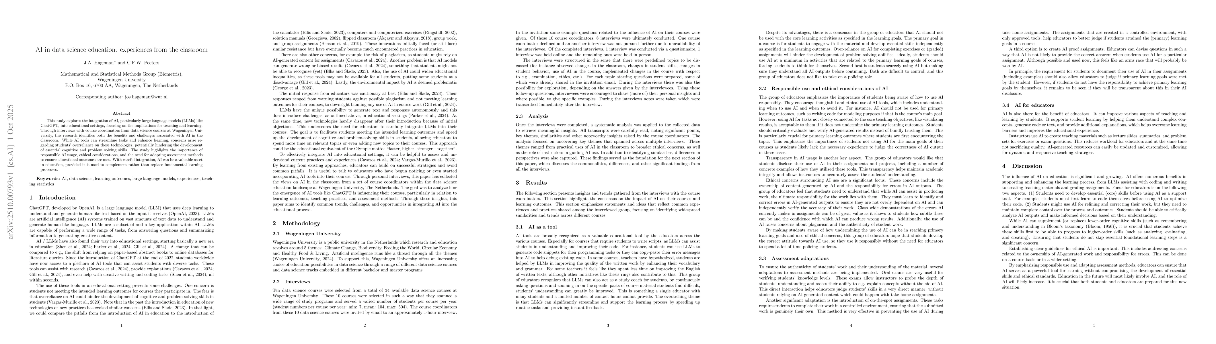 This study explores the integration of AI, particularly large language models (LLMs) like ChatGPT, into educational settings, focusing on the implications for teaching and learning. Through interviews with course coordinators from data science courses at Wageningen University, this research identifies both the benefits and challenges associated with AI in the classroom. While AI tools can streamline tasks and enhance learning, concerns arise regarding students' overreliance on these technologies, potentially hindering the development of essential cognitive and problem solving skills. The study highlights the importance of responsible AI usage, ethical considerations, and the need for adapting assessment methods to ensure educational outcomes are met. With careful integration, AI can be a valuable asset in education, provided it is used to complement rather than replace fundamental learning processes.