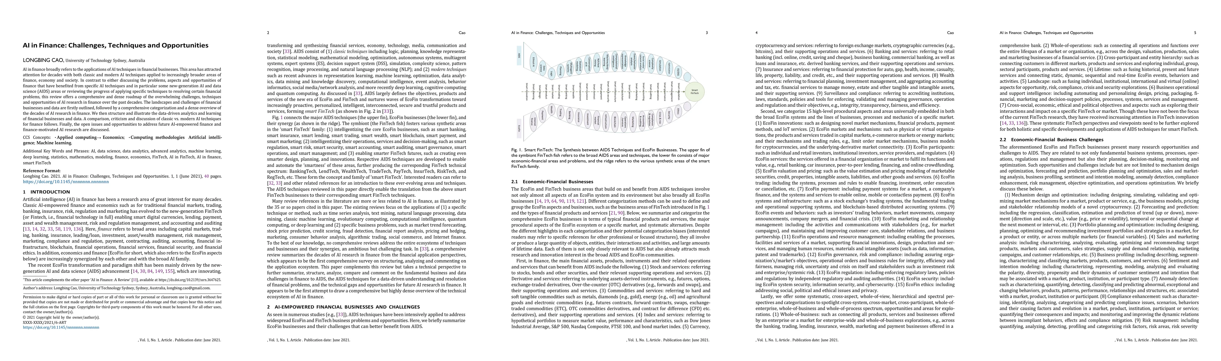 AI in finance broadly refers to the applications of AI techniques in financial businesses. This area has been lasting for decades with both classic and modern AI techniques applied to increasingly broader areas of finance, economy and society. In contrast to either discussing the problems, aspects and opportunities of finance that have benefited from specific AI techniques and in particular some new-generation AI and data science (AIDS) areas or reviewing the progress of applying specific techniques to resolving certain financial problems, this review offers a comprehensive and dense roadmap of the overwhelming challenges, techniques and opportunities of AI research in finance over the past decades. The landscapes and challenges of financial businesses and data are firstly outlined, followed by a comprehensive categorization and a dense overview of the decades of AI research in finance. We then structure and illustrate the data-driven analytics and learning of financial businesses and data. The comparison, criticism and discussion of classic vs. modern AI techniques for finance are followed. Lastly, open issues and opportunities address future AI-empowered finance and finance-motivated AI research.