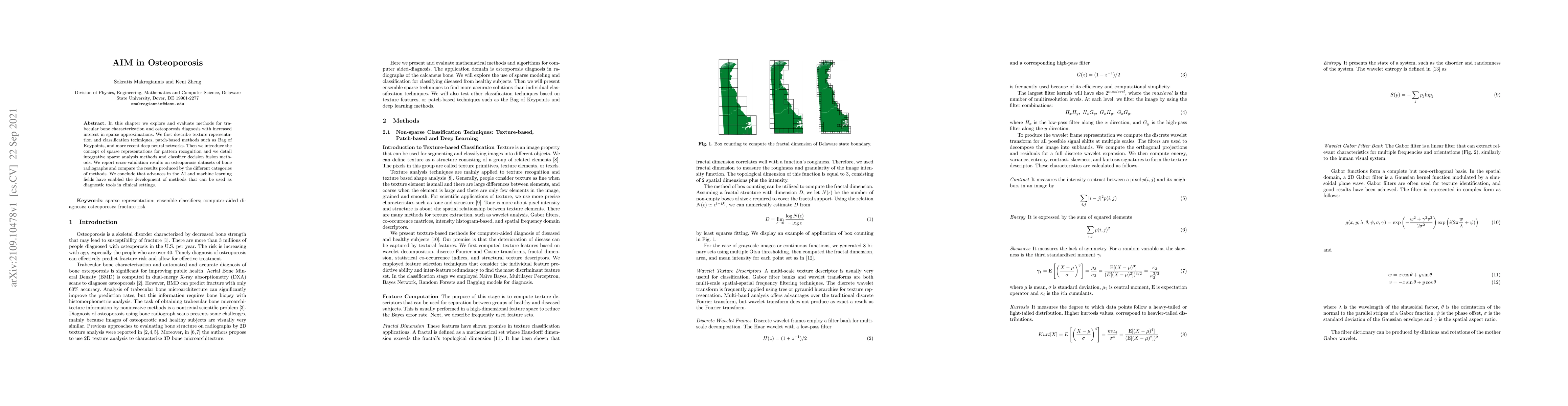 In this chapter we explore and evaluate methods for trabecular bone characterization and osteoporosis diagnosis with increased interest in sparse approximations. We first describe texture representation and classification techniques, patch-based methods such as Bag of Keypoints, and more recent deep neural networks. Then we introduce the concept of sparse representations for pattern recognition and we detail integrative sparse analysis methods and classifier decision fusion methods. We report cross-validation results on osteoporosis datasets of bone radiographs and compare the results produced by the different categories of methods. We conclude that advances in the AI and machine learning fields have enabled the development of methods that can be used as diagnostic tools in clinical settings.
