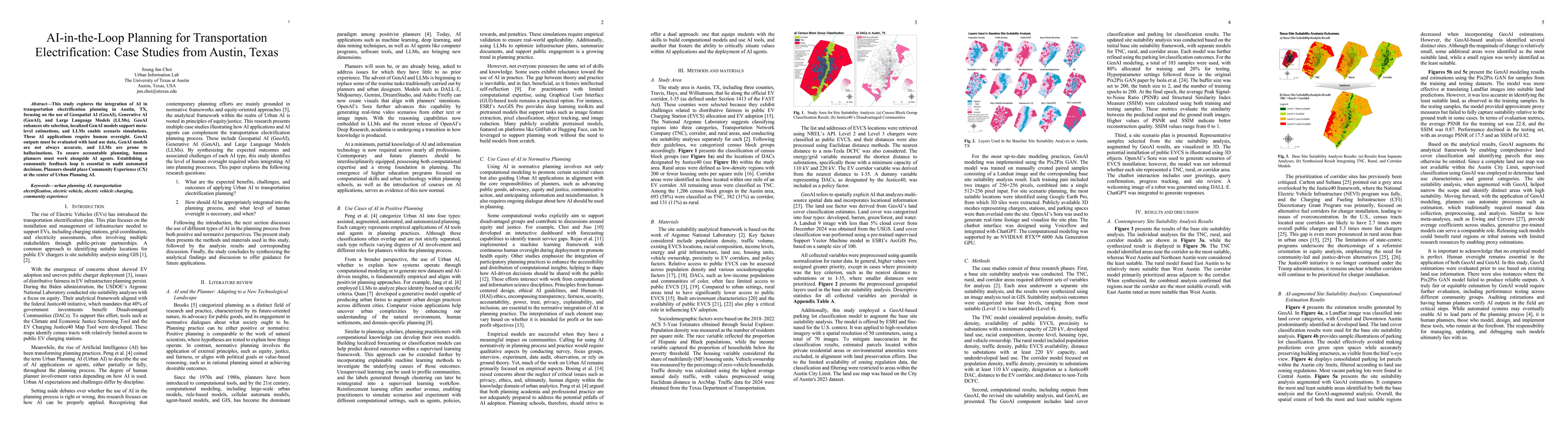 This study investigates the use of AI in transportation electrification planning in Austin, Texas, employing Geospatial AI for site selection, Generative AI for meta-level estimations, and Large Language Models for scenario simulations, emphasizing the necessity of human oversight and community feedback for accountable planning.