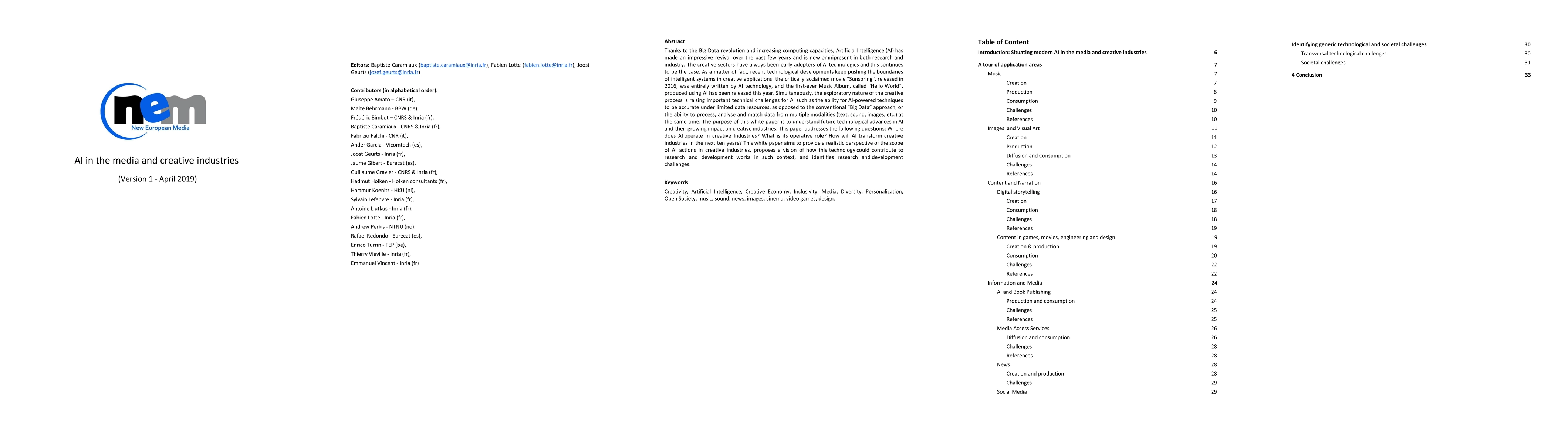 Thanks to the Big Data revolution and increasing computing capacities, Artificial Intelligence (AI) has made an impressive revival over the past few years and is now omnipresent in both research and industry. The creative sectors have always been early adopters of AI technologies and this continues to be the case. As a matter of fact, recent technological developments keep pushing the boundaries of intelligent systems in creative applications: the critically acclaimed movie "Sunspring", released in 2016, was entirely written by AI technology, and the first-ever Music Album, called "Hello World", produced using AI has been released this year. Simultaneously, the exploratory nature of the creative process is raising important technical challenges for AI such as the ability for AI-powered techniques to be accurate under limited data resources, as opposed to the conventional "Big Data" approach, or the ability to process, analyse and match data from multiple modalities (text, sound, images, etc.) at the same time. The purpose of this white paper is to understand future technological advances in AI and their growing impact on creative industries. This paper addresses the following questions: Where does AI operate in creative Industries? What is its operative role? How will AI transform creative industries in the next ten years? This white paper aims to provide a realistic perspective of the scope of AI actions in creative industries, proposes a vision of how this technology could contribute to research and development works in such context, and identifies research and development challenges.