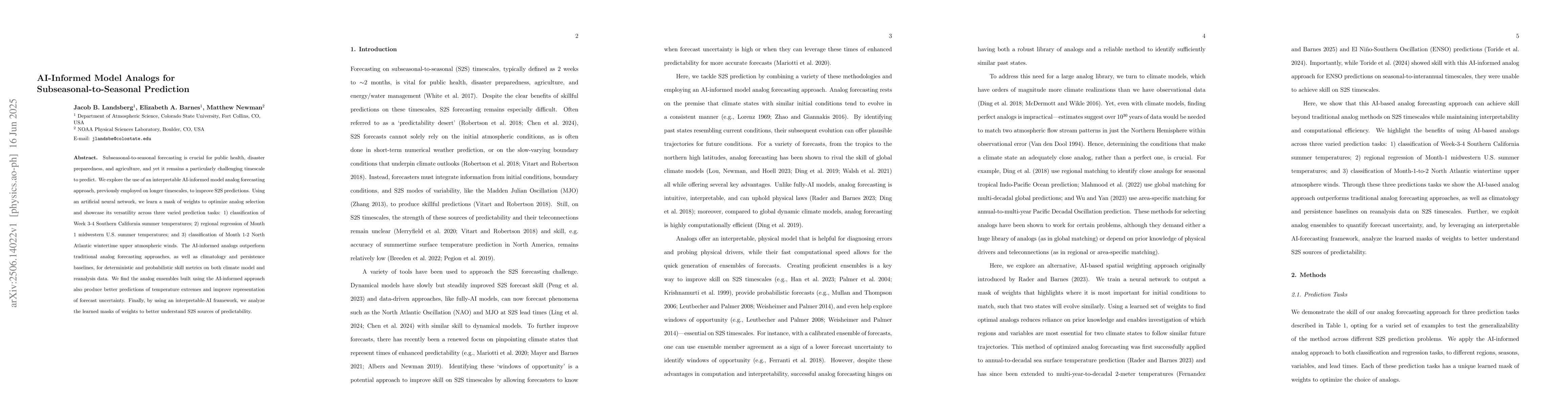 Subseasonal-to-seasonal forecasting is crucial for public health, disaster preparedness, and agriculture, and yet it remains a particularly challenging timescale to predict. We explore the use of an interpretable AI-informed model analog forecasting approach, previously employed on longer timescales, to improve S2S predictions. Using an artificial neural network, we learn a mask of weights to optimize analog selection and showcase its versatility across three varied prediction tasks: 1) classification of Week 3-4 Southern California summer temperatures; 2) regional regression of Month 1 midwestern U.S. summer temperatures; and 3) classification of Month 1-2 North Atlantic wintertime upper atmospheric winds. The AI-informed analogs outperform traditional analog forecasting approaches, as well as climatology and persistence baselines, for deterministic and probabilistic skill metrics on both climate model and reanalysis data. We find the analog ensembles built using the AI-informed approach also produce better predictions of temperature extremes and improve representation of forecast uncertainty. Finally, by using an interpretable-AI framework, we analyze the learned masks of weights to better understand S2S sources of predictability.