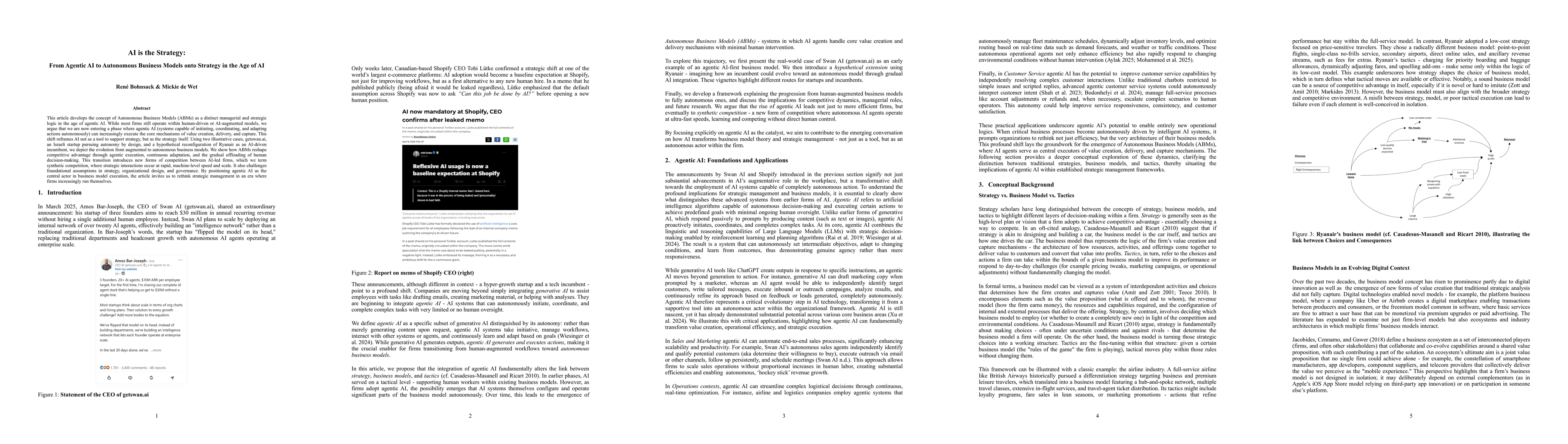This article develops the concept of Autonomous Business Models (ABMs) as a distinct managerial and strategic logic in the age of agentic AI. While most firms still operate within human-driven or AI-augmented models, we argue that we are now entering a phase where agentic AI (systems capable of initiating, coordinating, and adapting actions autonomously) can increasingly execute the core mechanisms of value creation, delivery, and capture. This shift reframes AI not as a tool to support strategy, but as the strategy itself. Using two illustrative cases, getswan.ai, an Israeli startup pursuing autonomy by design, and a hypothetical reconfiguration of Ryanair as an AI-driven incumbent, we depict the evolution from augmented to autonomous business models. We show how ABMs reshape competitive advantage through agentic execution, continuous adaptation, and the gradual offloading of human decision-making. This transition introduces new forms of competition between AI-led firms, which we term synthetic competition, where strategic interactions occur at rapid, machine-level speed and scale. It also challenges foundational assumptions in strategy, organizational design, and governance. By positioning agentic AI as the central actor in business model execution, the article invites us to rethink strategic management in an era where firms increasingly run themselves.