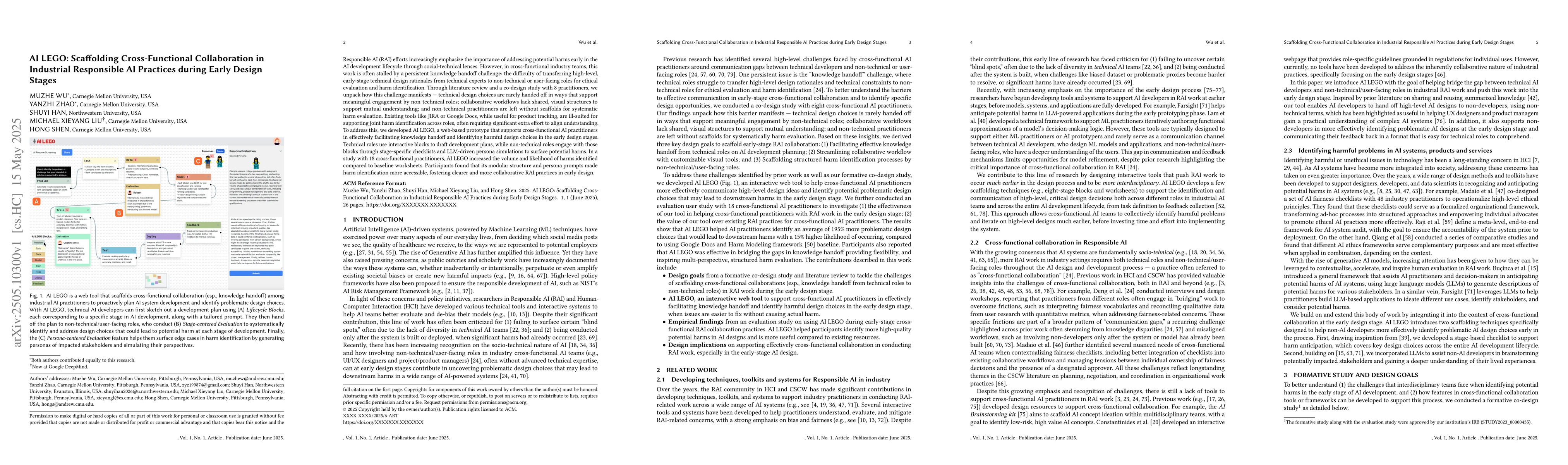 AI LEGO is a web-based tool that facilitates cross-functional collaboration in early design stages of AI development to identify potential harms, improving responsible AI practices.