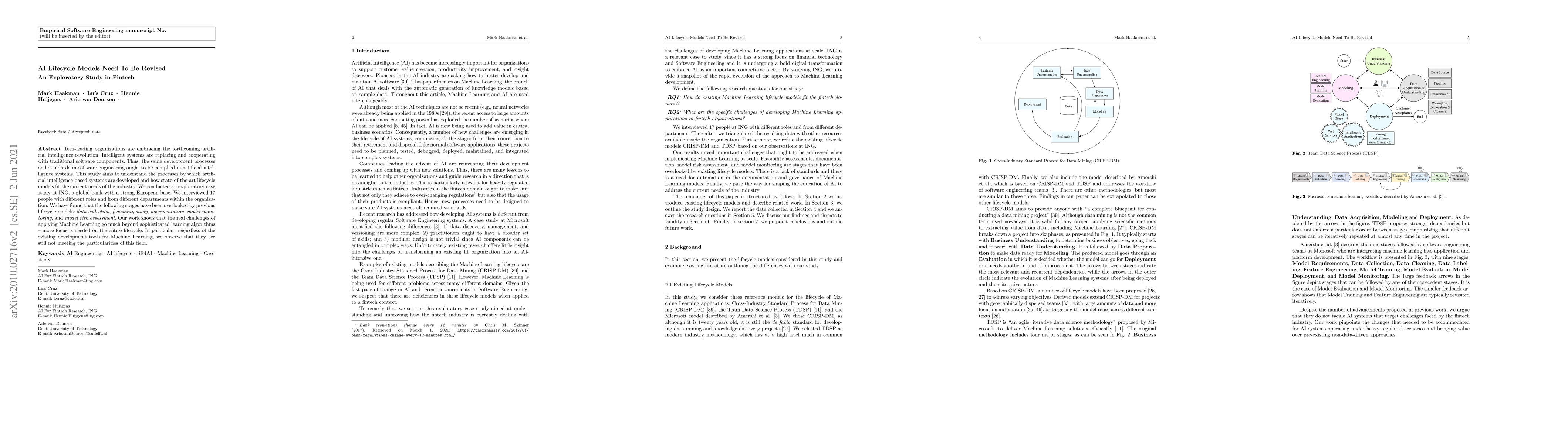 Tech-leading organizations are embracing the forthcoming artificial intelligence revolution. Intelligent systems are replacing and cooperating with traditional software components. Thus, the same development processes and standards in software engineering ought to be complied in artificial intelligence systems. This study aims to understand the processes by which artificial intelligence-based systems are developed and how state-of-the-art lifecycle models fit the current needs of the industry. We conducted an exploratory case study at ING, a global bank with a strong European base. We interviewed 17 people with different roles and from different departments within the organization. We have found that the following stages have been overlooked by previous lifecycle models: data collection, feasibility study, documentation, model monitoring, and model risk assessment. Our work shows that the real challenges of applying Machine Learning go much beyond sophisticated learning algorithms - more focus is needed on the entire lifecycle. In particular, regardless of the existing development tools for Machine Learning, we observe that they are still not meeting the particularities of this field.