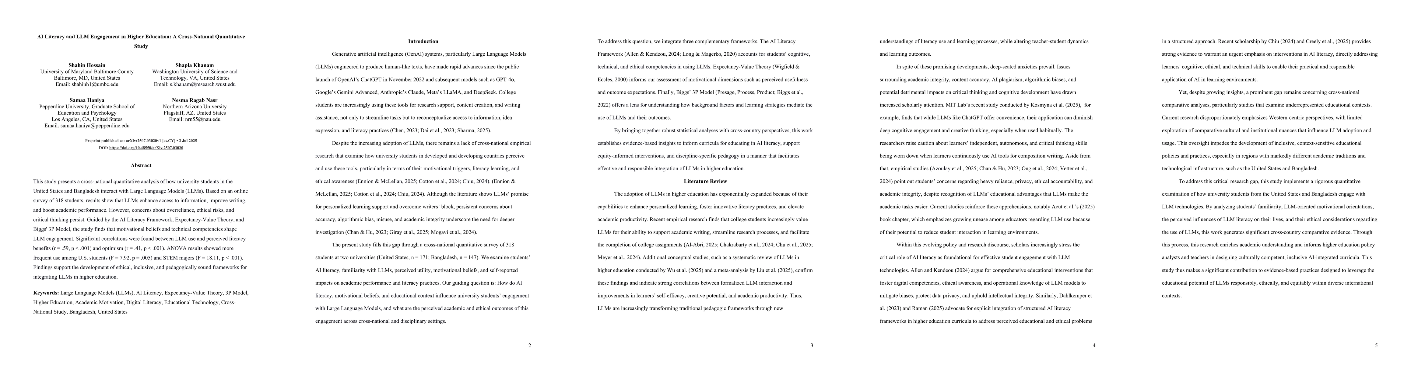 This study presents a cross-national quantitative analysis of how university students in the United States and Bangladesh interact with Large Language Models (LLMs). Based on an online survey of 318 students, results show that LLMs enhance access to information, improve writing, and boost academic performance. However, concerns about overreliance, ethical risks, and critical thinking persist. Guided by the AI Literacy Framework, Expectancy-Value Theory, and Biggs' 3P Model, the study finds that motivational beliefs and technical competencies shape LLM engagement. Significant correlations were found between LLM use and perceived literacy benefits (r = .59, p < .001) and optimism (r = .41, p < .001). ANOVA results showed more frequent use among U.S. students (F = 7.92, p = .005) and STEM majors (F = 18.11, p < .001). Findings support the development of ethical, inclusive, and pedagogically sound frameworks for integrating LLMs in higher education.