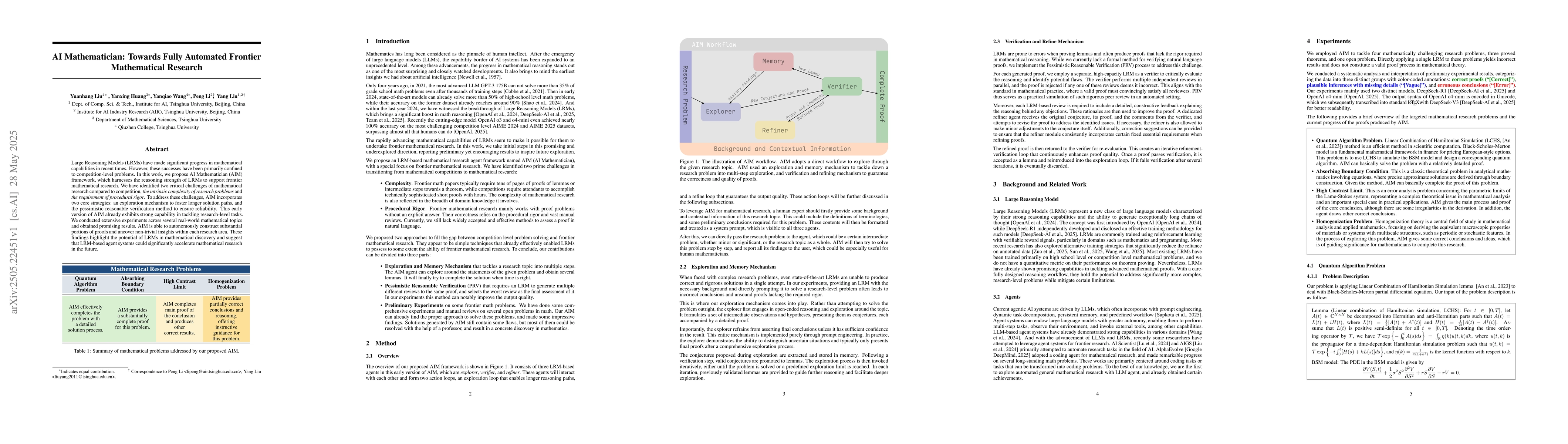 Researchers propose an AI framework called AIM to tackle frontier mathematical research problems, leveraging Large Reasoning Models for exploration and verification, and achieving promising results in real-world topics.