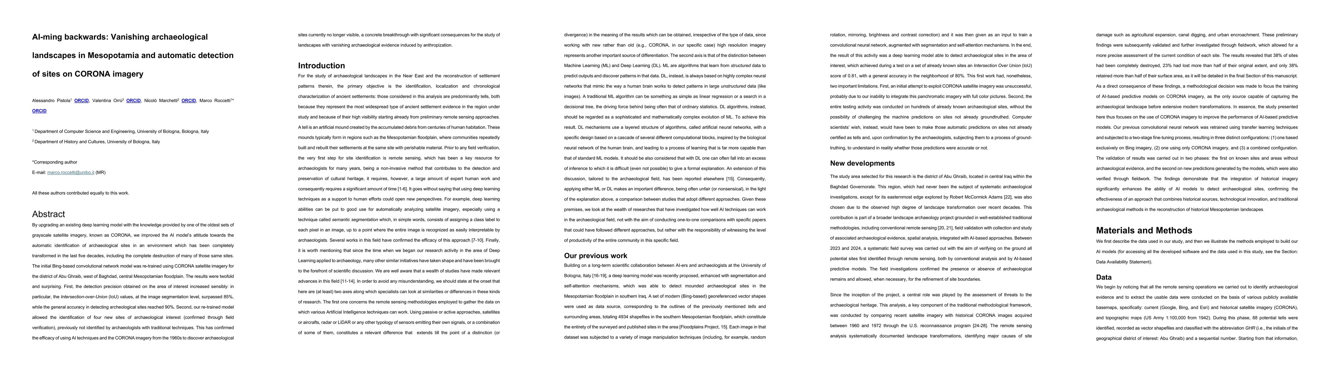 By upgrading an existing deep learning model with the knowledge provided by one of the oldest sets of grayscale satellite imagery, known as CORONA, we improved the AI model attitude towards the automatic identification of archaeological sites in an environment which has been completely transformed in the last five decades, including the complete destruction of many of those same sites. The initial Bing based convolutional network model was retrained using CORONA satellite imagery for the district of Abu Ghraib, west of Baghdad, central Mesopotamian floodplain. The results were twofold and surprising. First, the detection precision obtained on the area of interest increased sensibly: in particular, the Intersection over Union (IoU) values, at the image segmentation level, surpassed 85 percent, while the general accuracy in detecting archeological sites reached 90 percent. Second, our retrained model allowed the identification of four new sites of archaeological interest (confirmed through field verification), previously not identified by archaeologists with traditional techniques. This has confirmed the efficacy of using AI techniques and the CORONA imagery from the 1960 to discover archaeological sites currently no longer visible, a concrete breakthrough with significant consequences for the study of landscapes with vanishing archaeological evidence induced by anthropization