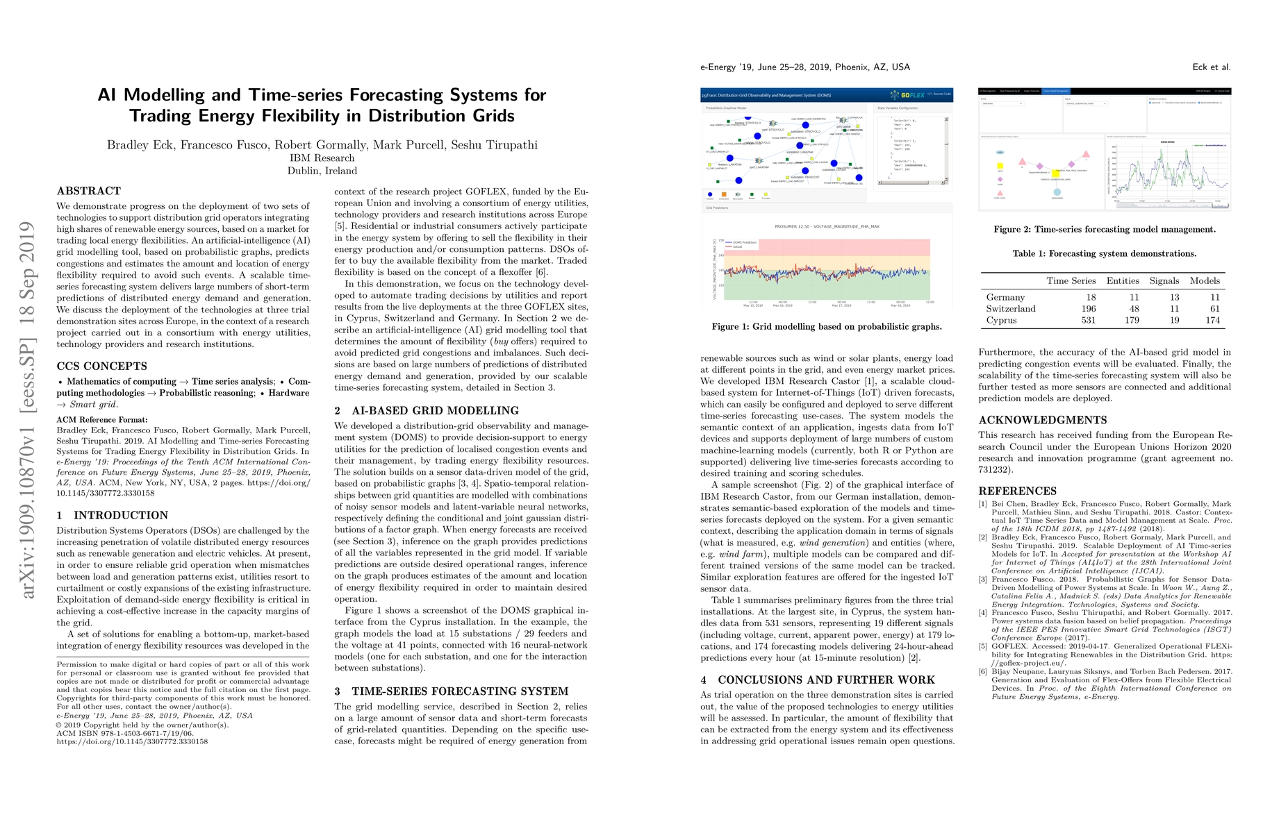 We demonstrate progress on the deployment of two sets of technologies to support distribution grid operators integrating high shares of renewable energy sources, based on a market for trading local energy flexibilities. An artificial-intelligence (AI) grid modelling tool, based on probabilistic graphs, predicts congestions and estimates the amount and location of energy flexibility required to avoid such events. A scalable time-series forecasting system delivers large numbers of short-term predictions of distributed energy demand and generation. We discuss the deployment of the technologies at three trial demonstration sites across Europe, in the context of a research project carried out in a consortium with energy utilities, technology providers and research institutions.