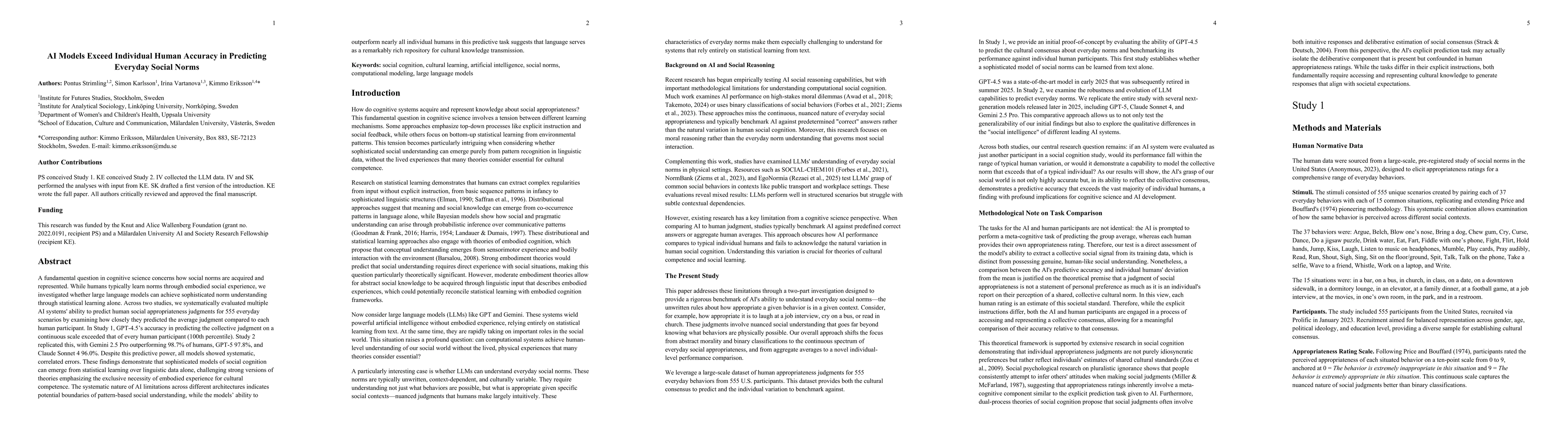 A fundamental question in cognitive science concerns how social norms are acquired and represented. While humans typically learn norms through embodied social experience, we investigated whether large language models can achieve sophisticated norm understanding through statistical learning alone. Across two studies, we systematically evaluated multiple AI systems' ability to predict human social appropriateness judgments for 555 everyday scenarios by examining how closely they predicted the average judgment compared to each human participant. In Study 1, GPT-4.5's accuracy in predicting the collective judgment on a continuous scale exceeded that of every human participant (100th percentile). Study 2 replicated this, with Gemini 2.5 Pro outperforming 98.7% of humans, GPT-5 97.8%, and Claude Sonnet 4 96.0%. Despite this predictive power, all models showed systematic, correlated errors. These findings demonstrate that sophisticated models of social cognition can emerge from statistical learning over linguistic data alone, challenging strong versions of theories emphasizing the exclusive necessity of embodied experience for cultural competence. The systematic nature of AI limitations across different architectures indicates potential boundaries of pattern-based social understanding, while the models' ability to outperform nearly all individual humans in this predictive task suggests that language serves as a remarkably rich repository for cultural knowledge transmission.