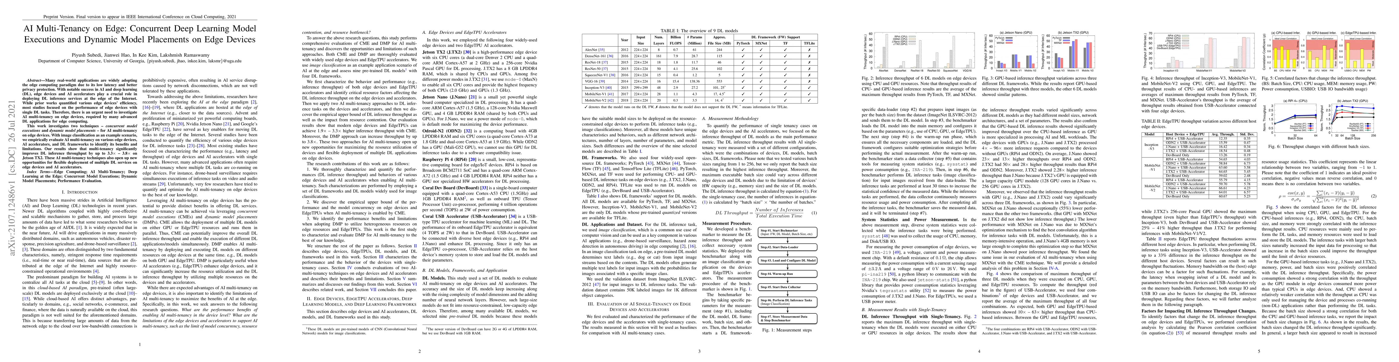 This paper explores AI multi-tenancy on edge devices through concurrent deep learning model executions and dynamic model placements, demonstrating significant throughput improvements up to 3.8x on Jetson TX2. The study highlights the potential for flexible deployment of multiple DL services on edge devices and AI accelerators.