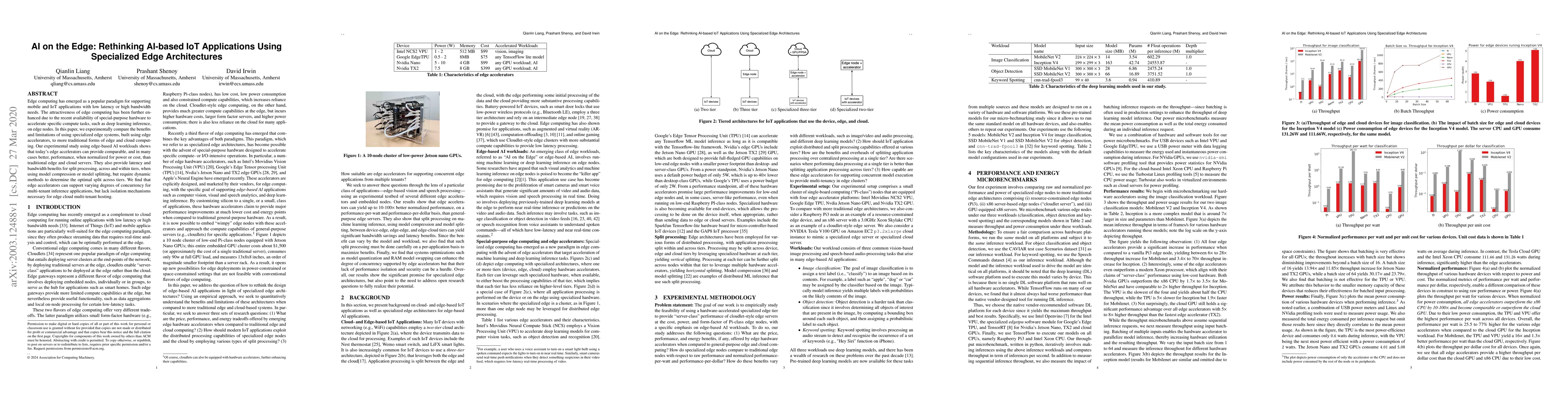This paper evaluates specialized edge architectures with edge accelerators for AI-based IoT applications, finding they offer comparable or better performance, lower latency, and bandwidth benefits compared to traditional edge and cloud computing, though they lack isolation for multi-tenant hosting.